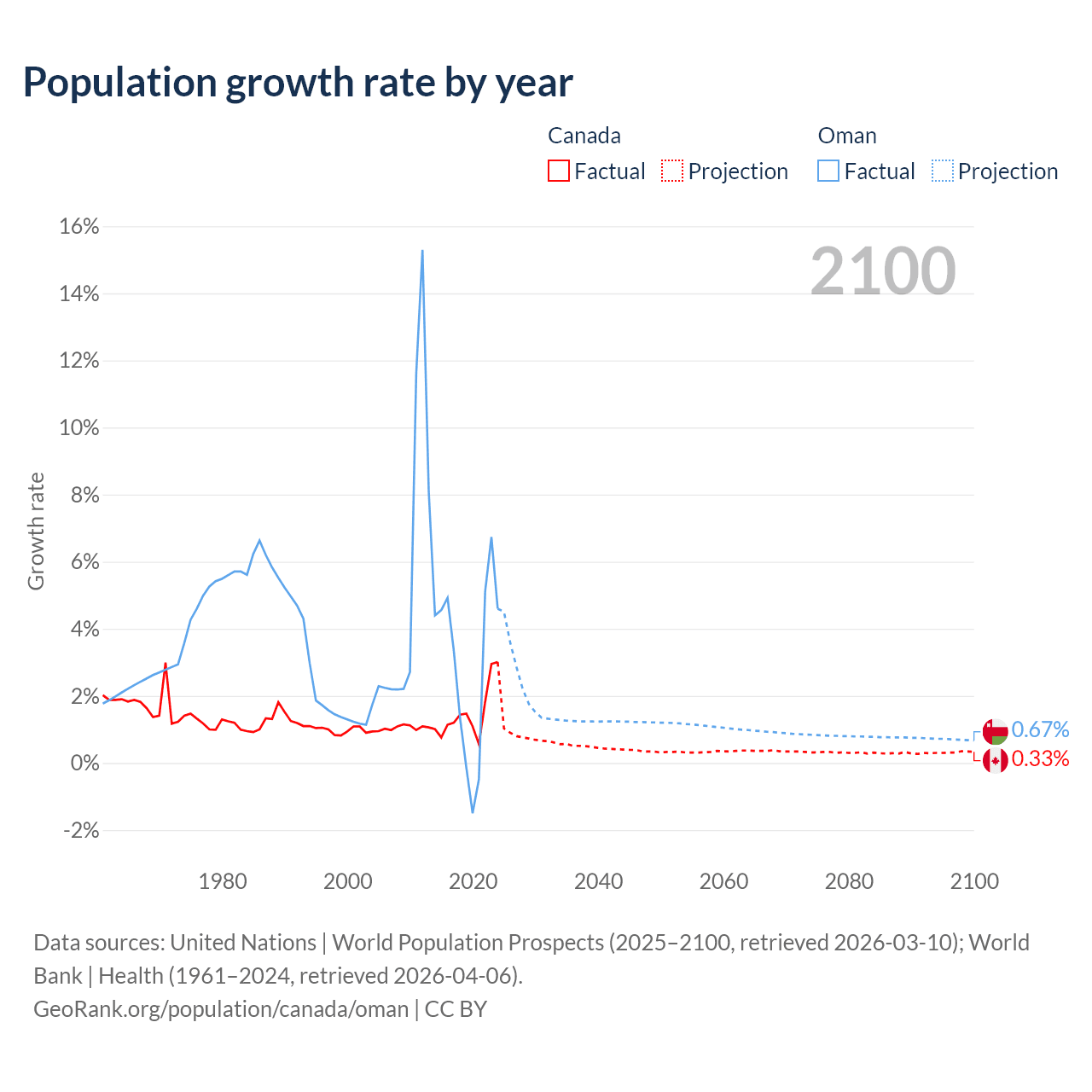 - For the last 10 years, Canada has had an average growth rate of +1.5% per year vs +2.99% in Oman.