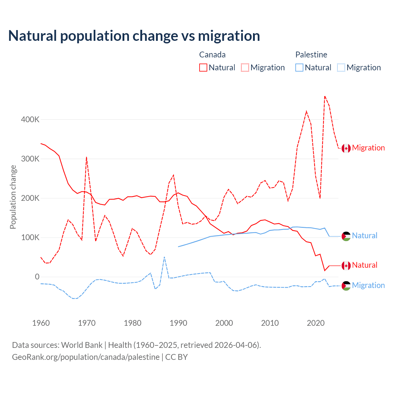 Over the last 10 years, 19.4% of the population change in Canada is from natural causes (a gain of 789,345 people) and 80.6% is from migration (a gain of 3,276,554 people). In Palestine 85.7% is from natural causes (a gain of 1,218,010 people) and 14.3% is from migration (a loss of 202,820 people).