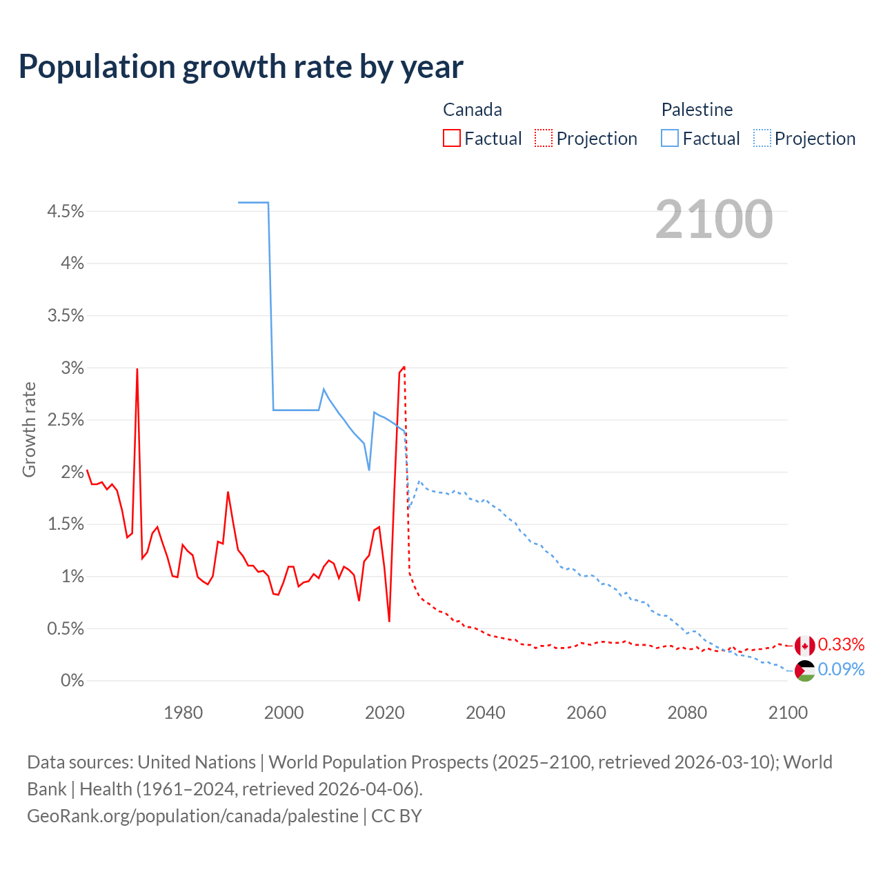 - For the last 10 years, Canada has had an average growth rate of +1.5% per year vs +2.4% in Palestine.