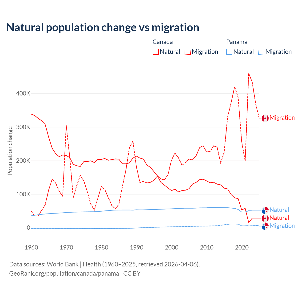 Over the last 10 years, 19.4% of the population change in Canada is from natural causes (a gain of 789,345 people) and 80.6% is from migration (a gain of 3,276,554 people). In Panama 86.5% is from natural causes (a gain of 544,211 people) and 13.5% is from migration (a gain of 84,849 people).