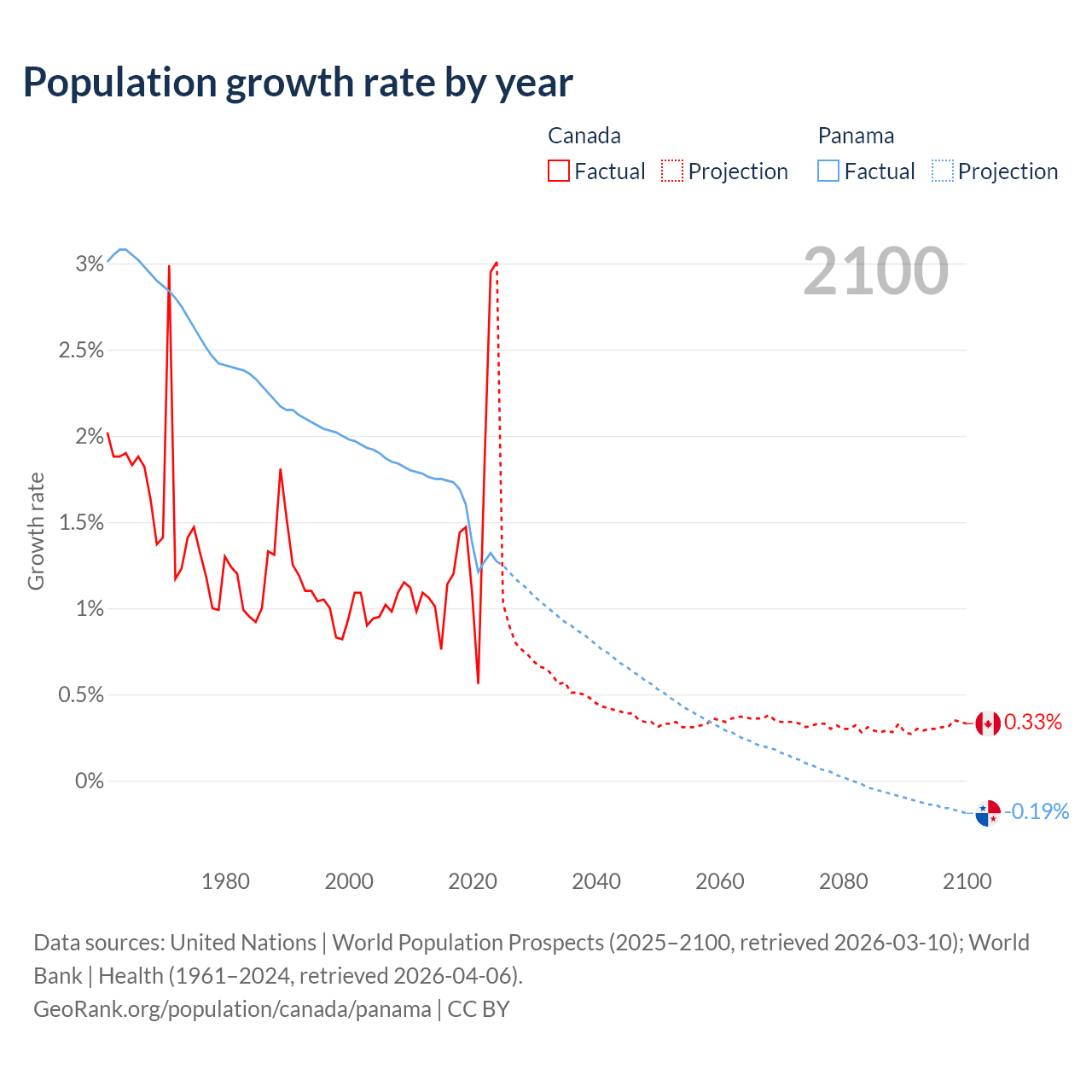 - For the last 10 years, Canada has had an average growth rate of +1.5% per year vs +1.52% in Panama.