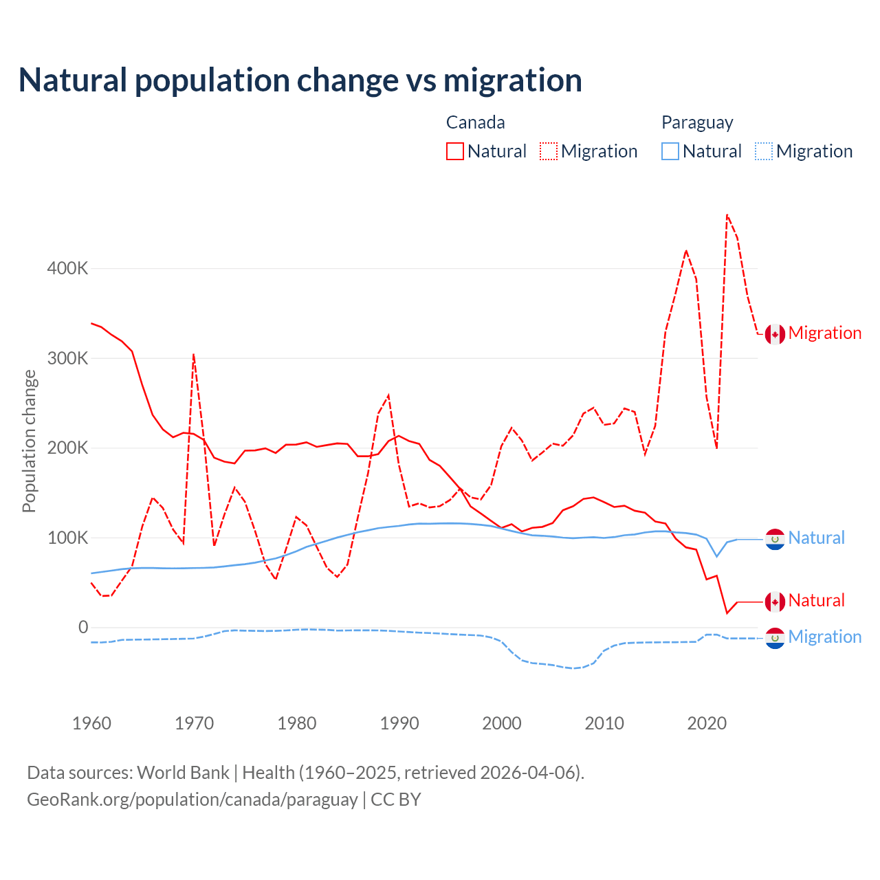 Over the last 10 years, 19.4% of the population change in Canada is from natural causes (a gain of 789,345 people) and 80.6% is from migration (a gain of 3,276,554 people). In Paraguay 87.6% is from natural causes (a gain of 1,002,636 people) and 12.4% is from migration (a loss of 141,377 people).