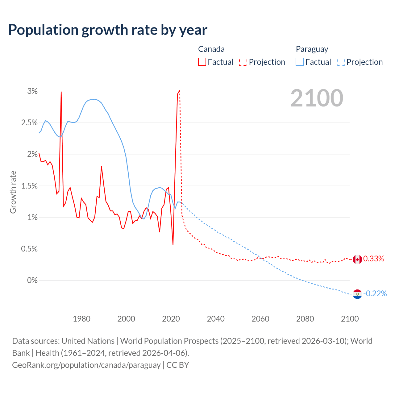 - For the last 10 years, Canada has had an average growth rate of +1.5% per year vs +1.34% in Paraguay.