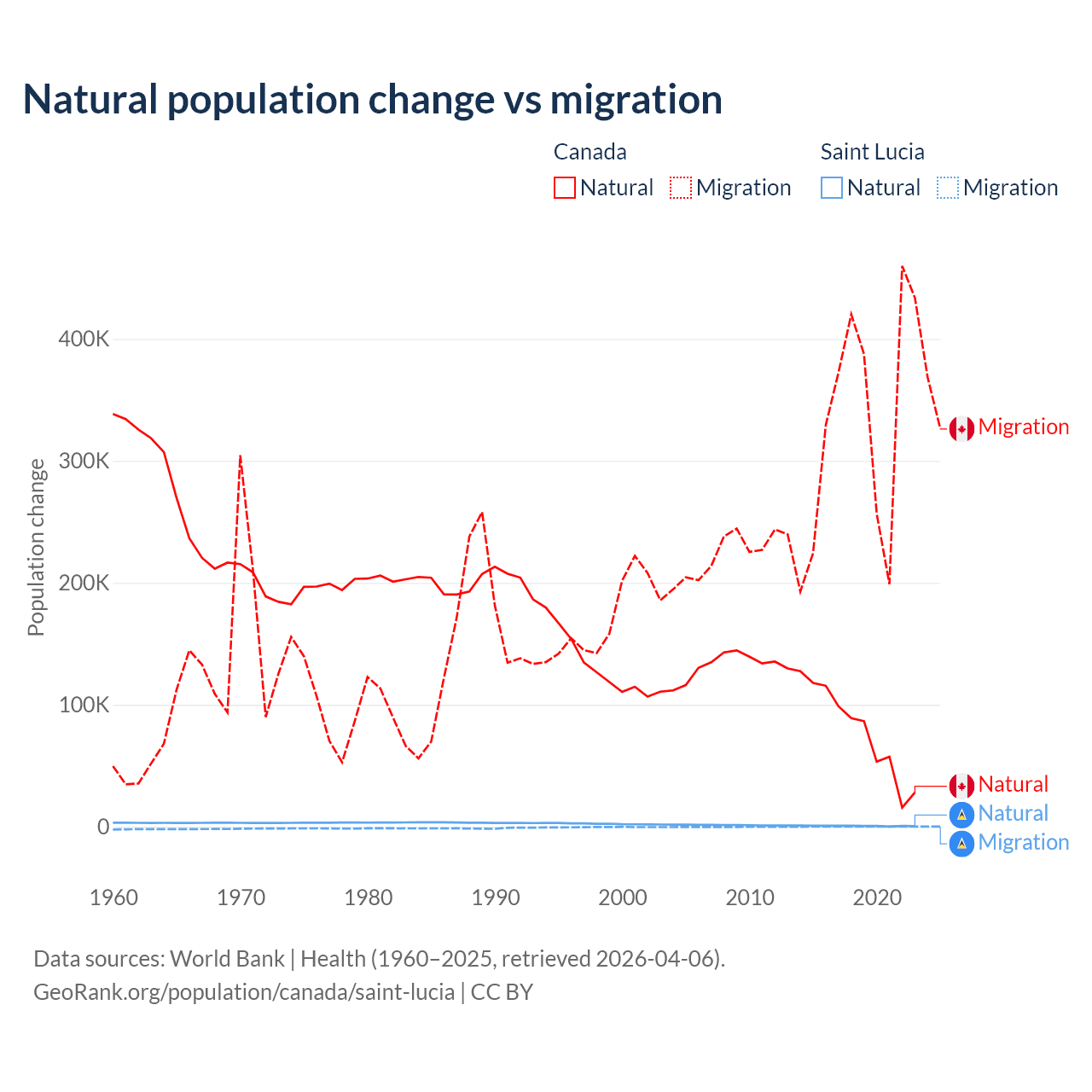 Over the last 10 years, 19.4% of the population change in Canada is from natural causes (a gain of 789,345 people) and 80.6% is from migration (a gain of 3,276,554 people). In Saint Lucia 95.7% is from natural causes (a gain of 6,039 people) and 4.31% is from migration (a loss of 272 people).