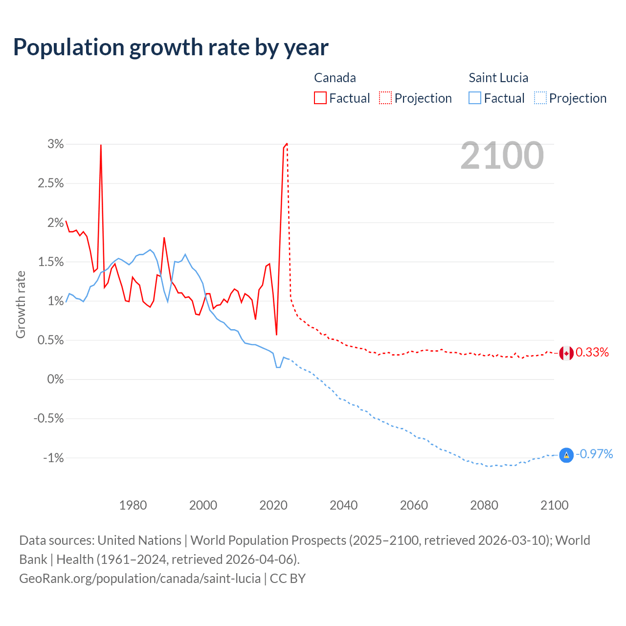 - For the last 10 years, Canada has had an average growth rate of +1.5% per year vs +0.33% in Saint Lucia.
