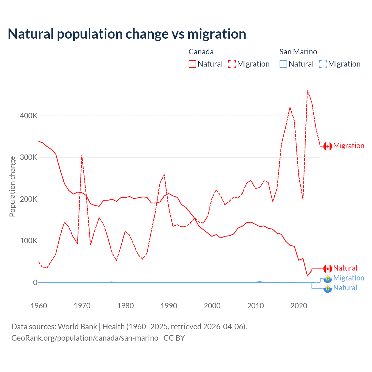 Over the last 10 years, 19.4% of the population change in Canada is from natural causes (a gain of 789,345 people) and 80.6% is from migration (a gain of 3,276,554 people). In San Marino 40.9% is from natural causes (a loss of 358 people) and 59.1% is from migration (a gain of 517 people).