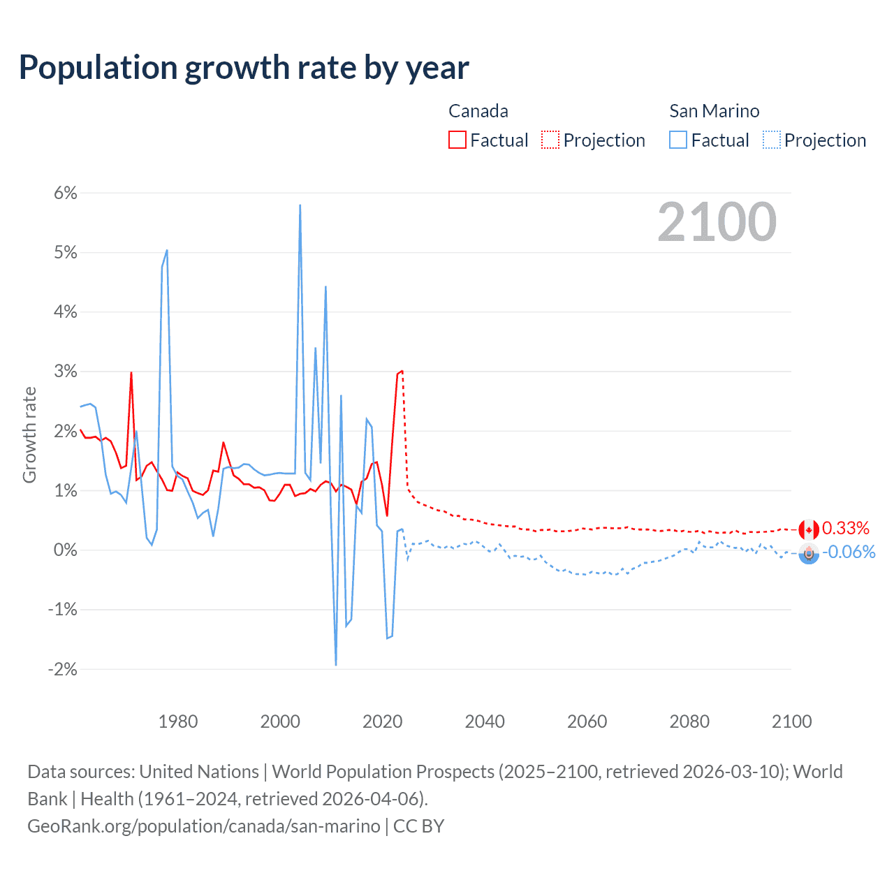- For the last 10 years, Canada has had an average growth rate of +1.5% per year vs +0.26% in San Marino.