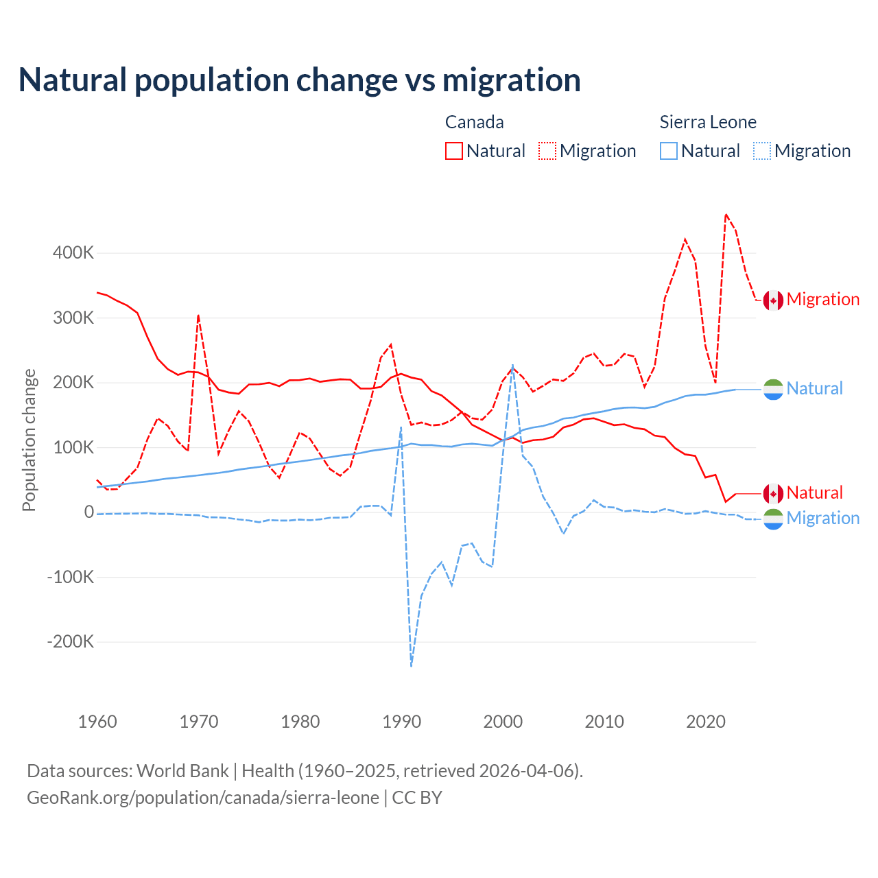 Over the last 10 years, 19.4% of the population change in Canada is from natural causes (a gain of 789,345 people) and 80.6% is from migration (a gain of 3,276,554 people). In Sierra Leone 99.6% is from natural causes (a gain of 1,764,049 people) and 0.41% is from migration (a loss of 7,211 people).