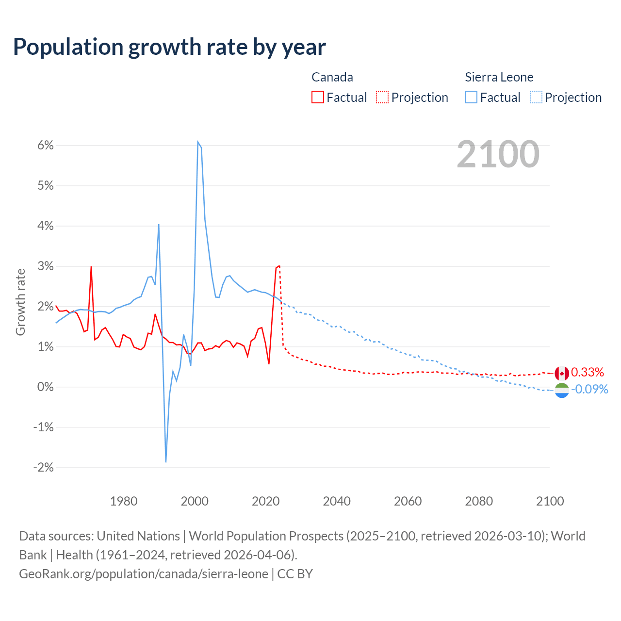- For the last 10 years, Canada has had an average growth rate of +1.5% per year vs +2.32% in Sierra Leone.