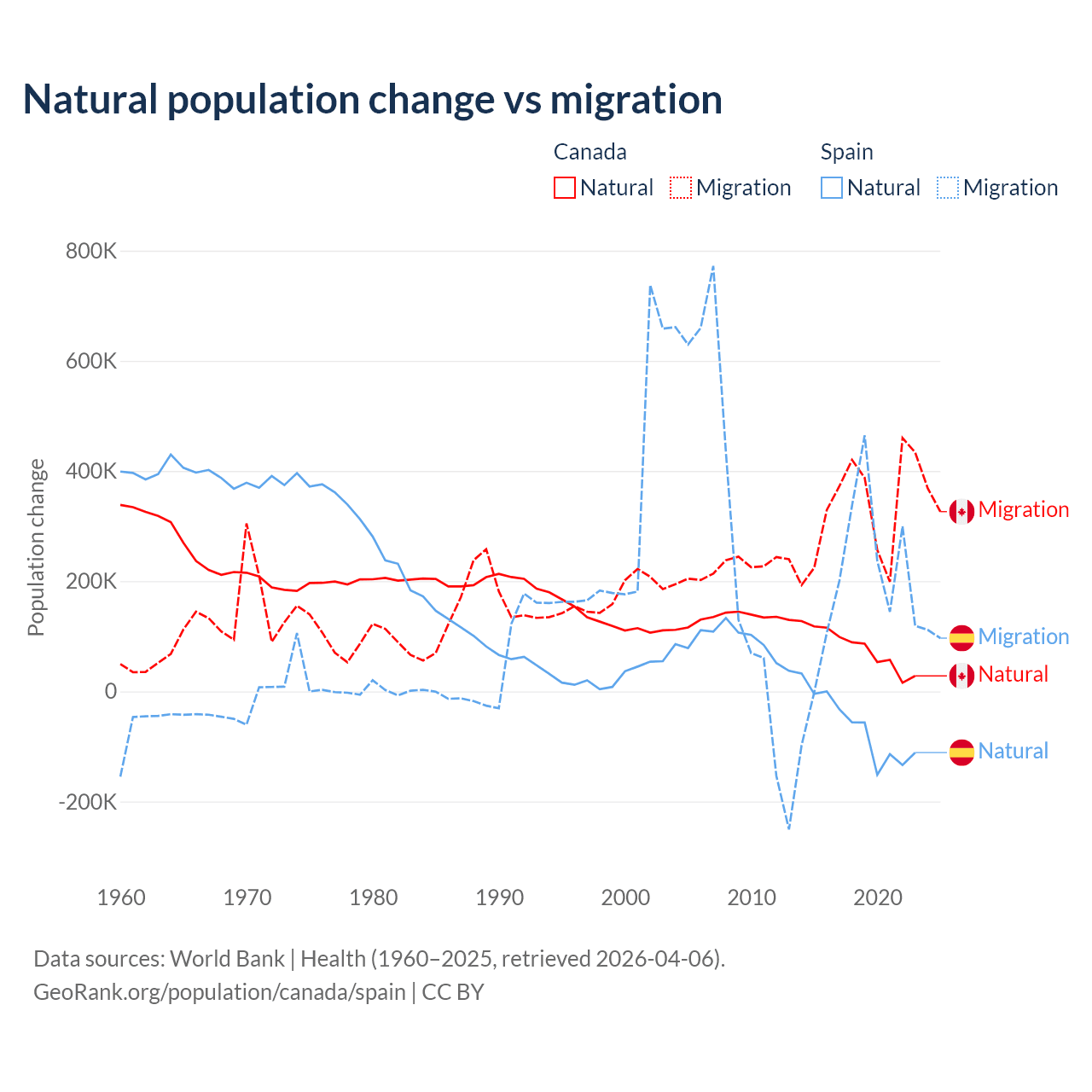 Over the last 10 years, 19.4% of the population change in Canada is from natural causes (a gain of 789,345 people) and 80.6% is from migration (a gain of 3,276,554 people). In Spain 25.8% is from natural causes (a loss of 627,829 people) and 74.2% is from migration (a gain of 1,810,127 people).