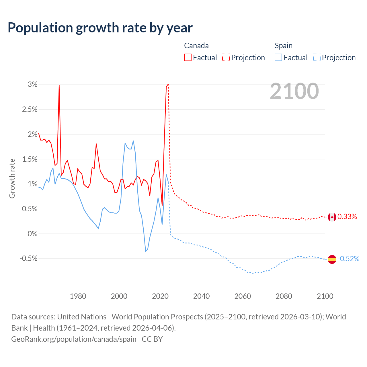 - For the last 10 years, Canada has had an average growth rate of +1.5% per year vs +0.43% in Spain.