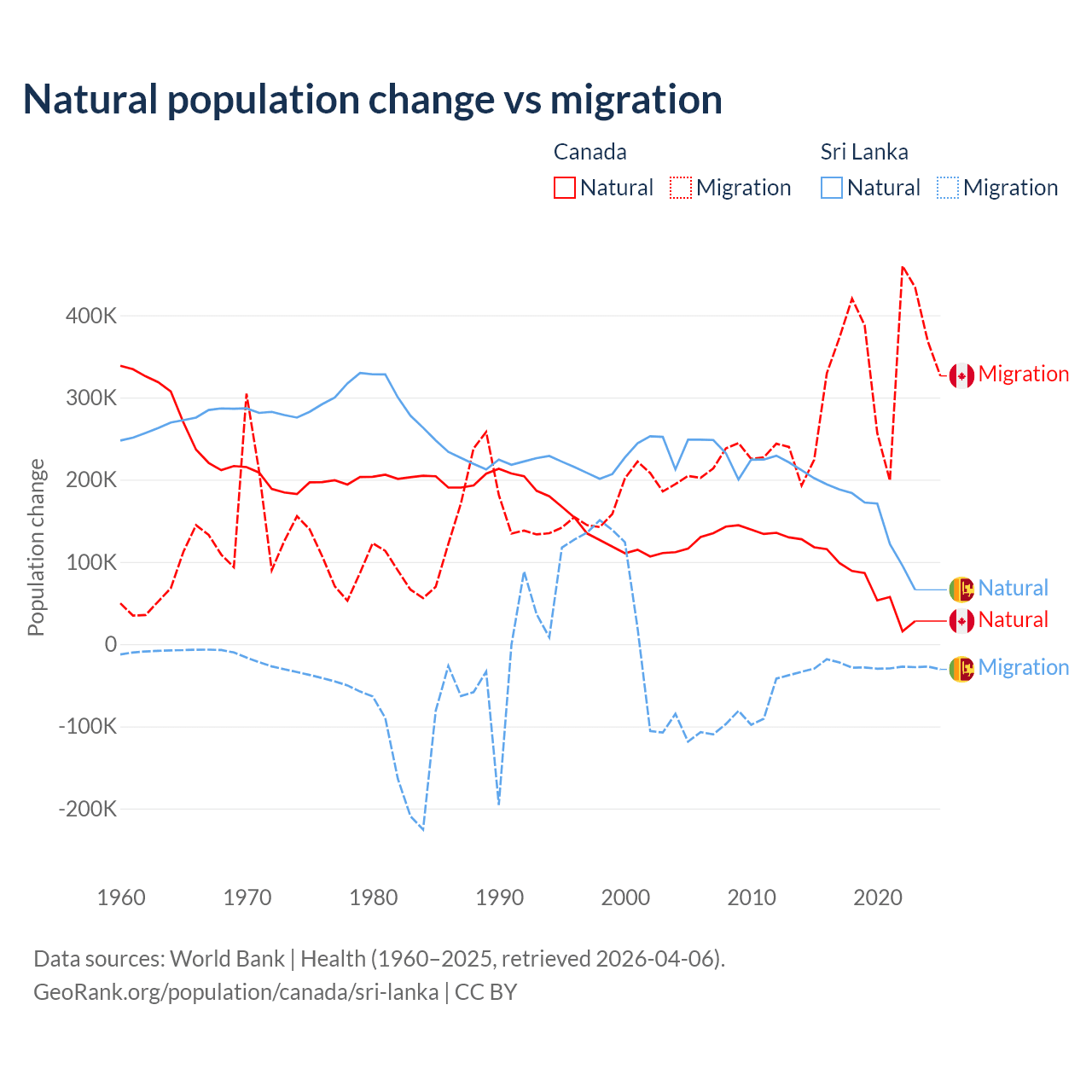 Over the last 10 years, 19.4% of the population change in Canada is from natural causes (a gain of 789,345 people) and 80.6% is from migration (a gain of 3,276,554 people). In Sri Lanka 85.3% is from natural causes (a gain of 1,605,749 people) and 14.7% is from migration (a loss of 276,121 people).