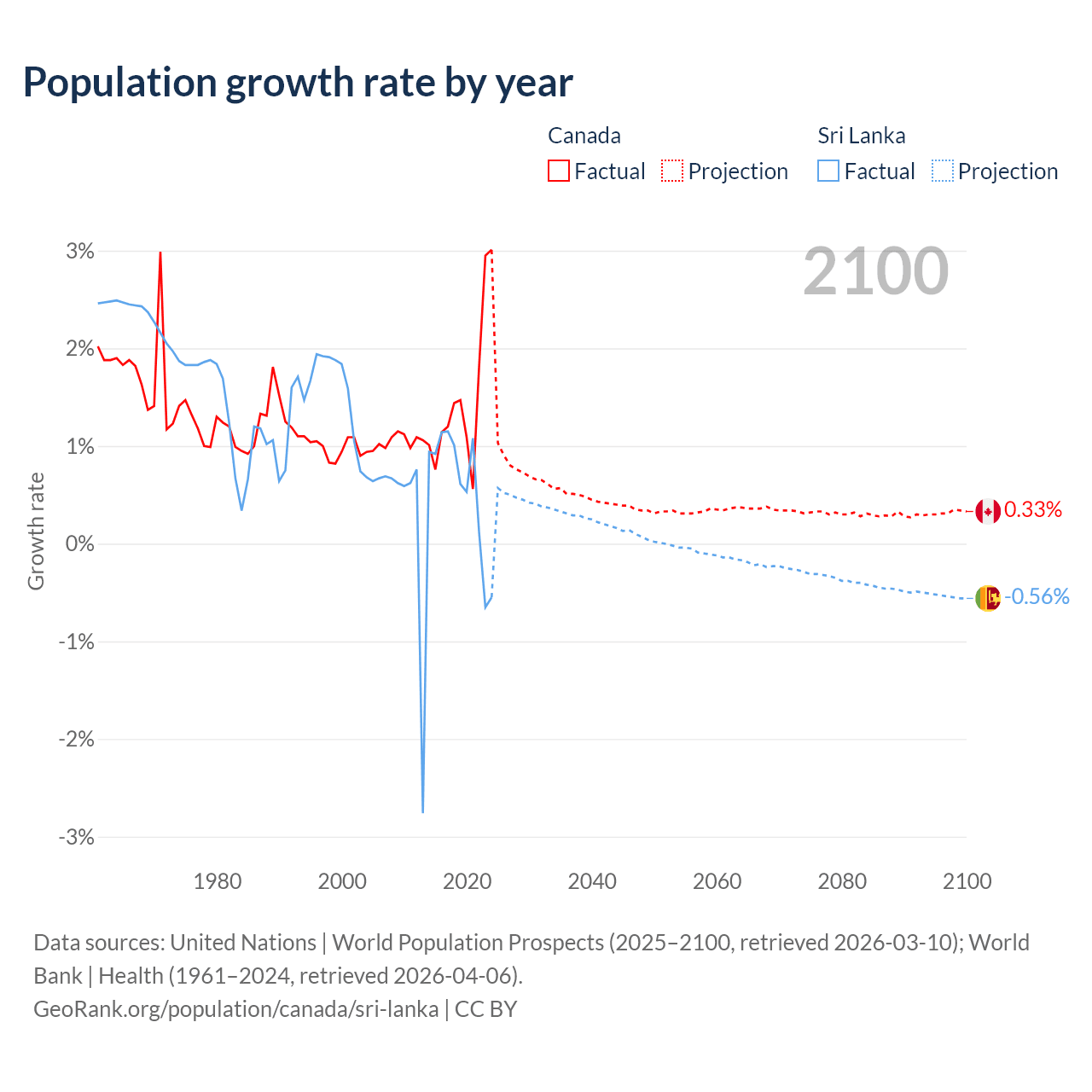 - For the last 10 years, Canada has had an average growth rate of +1.5% per year vs +0.57% in Sri Lanka.