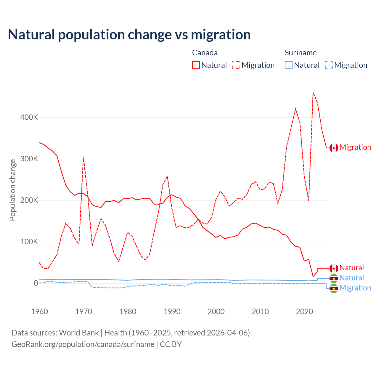 Over the last 10 years, 19.4% of the population change in Canada is from natural causes (a gain of 789,345 people) and 80.6% is from migration (a gain of 3,276,554 people). In Suriname 90.3% is from natural causes (a gain of 66,709 people) and 9.72% is from migration (a loss of 7,185 people).