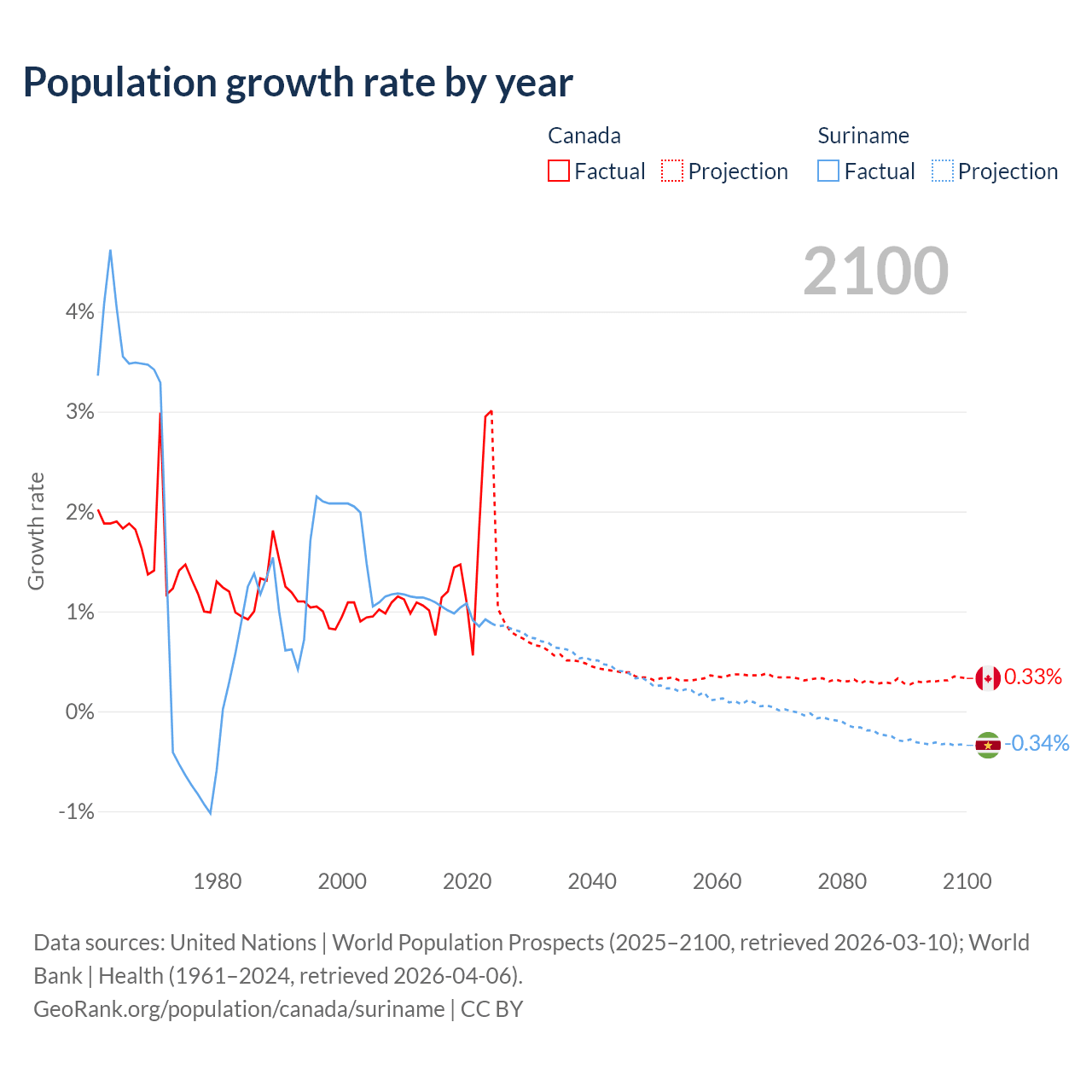 - For the last 10 years, Canada has had an average growth rate of +1.5% per year vs +0.99% in Suriname.