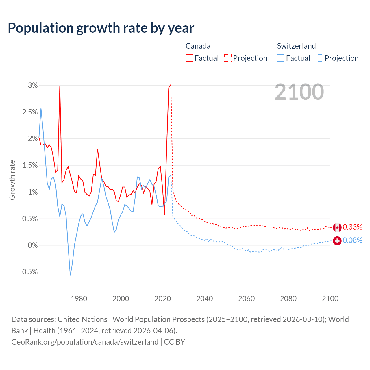 - For the last 10 years, Canada has had an average growth rate of +1.5% per year vs +0.98% in Switzerland.