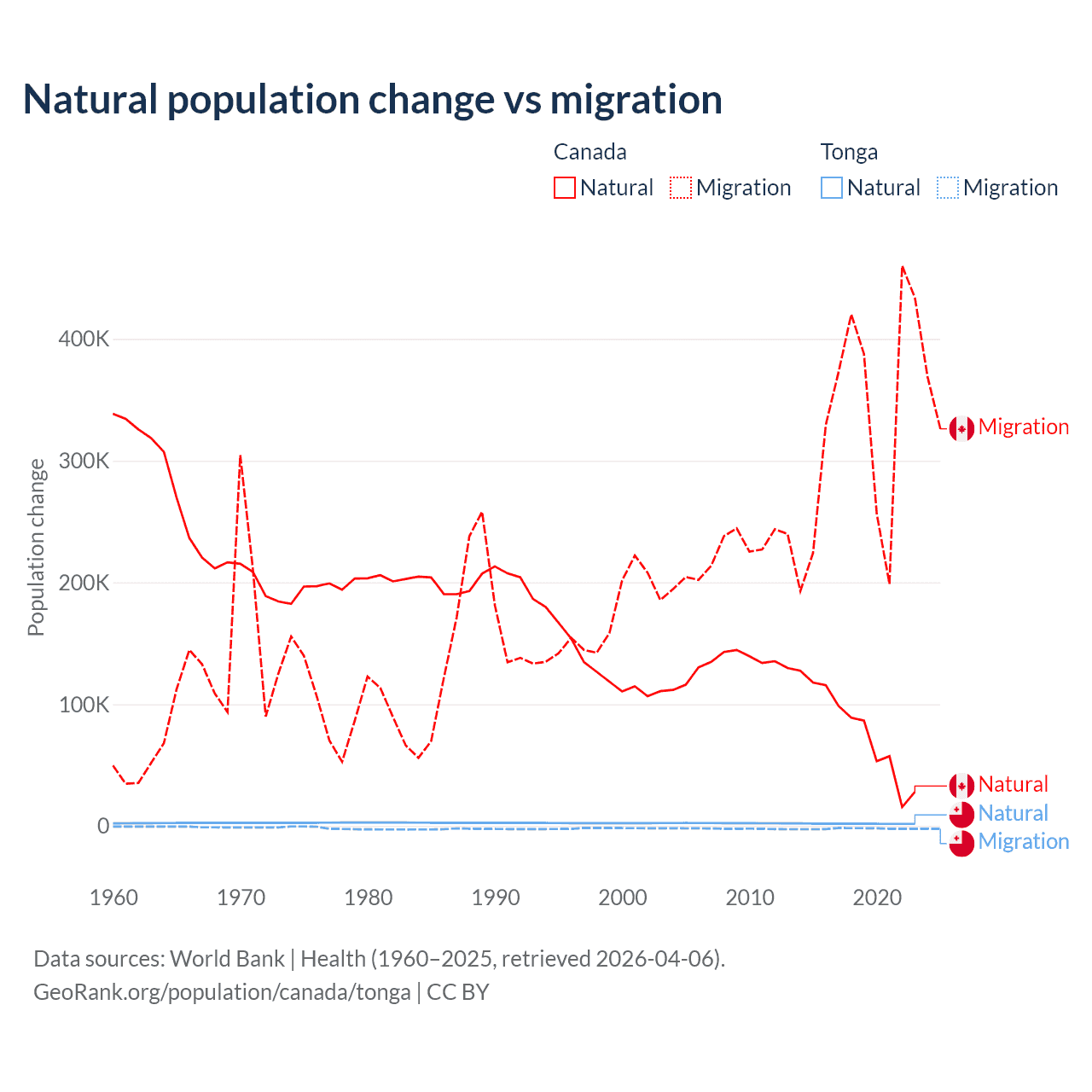 Over the last 10 years, 19.4% of the population change in Canada is from natural causes (a gain of 789,345 people) and 80.6% is from migration (a gain of 3,276,554 people). In Tonga 46.9% is from natural causes (a gain of 18,919 people) and 53.1% is from migration (a loss of 21,384 people).