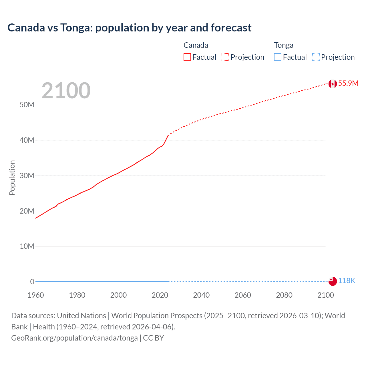 Canada vs Tonga: population by year and forecast