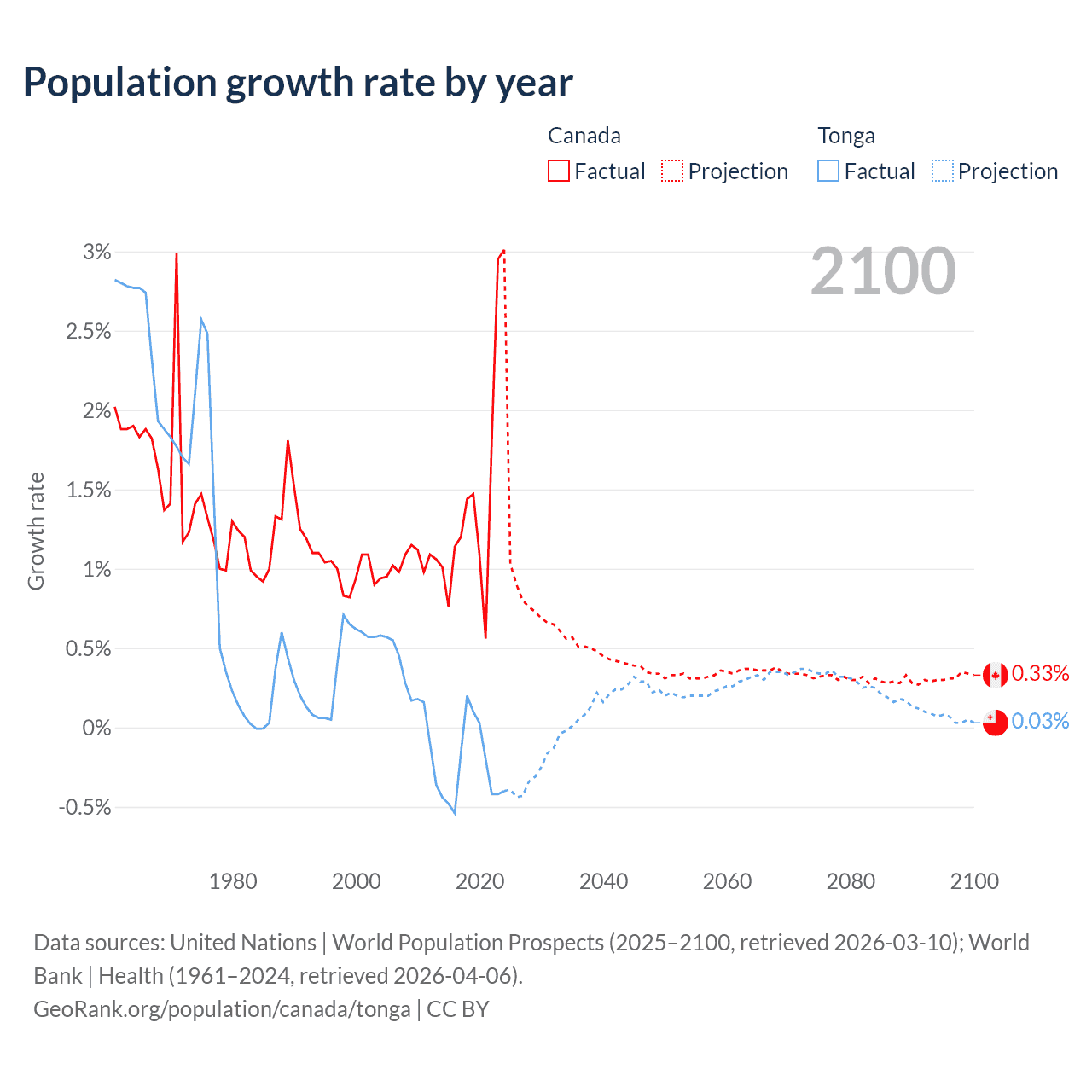 - For the last 10 years, Canada has had an average growth rate of +1.5% per year vs -0.25% in Tonga.