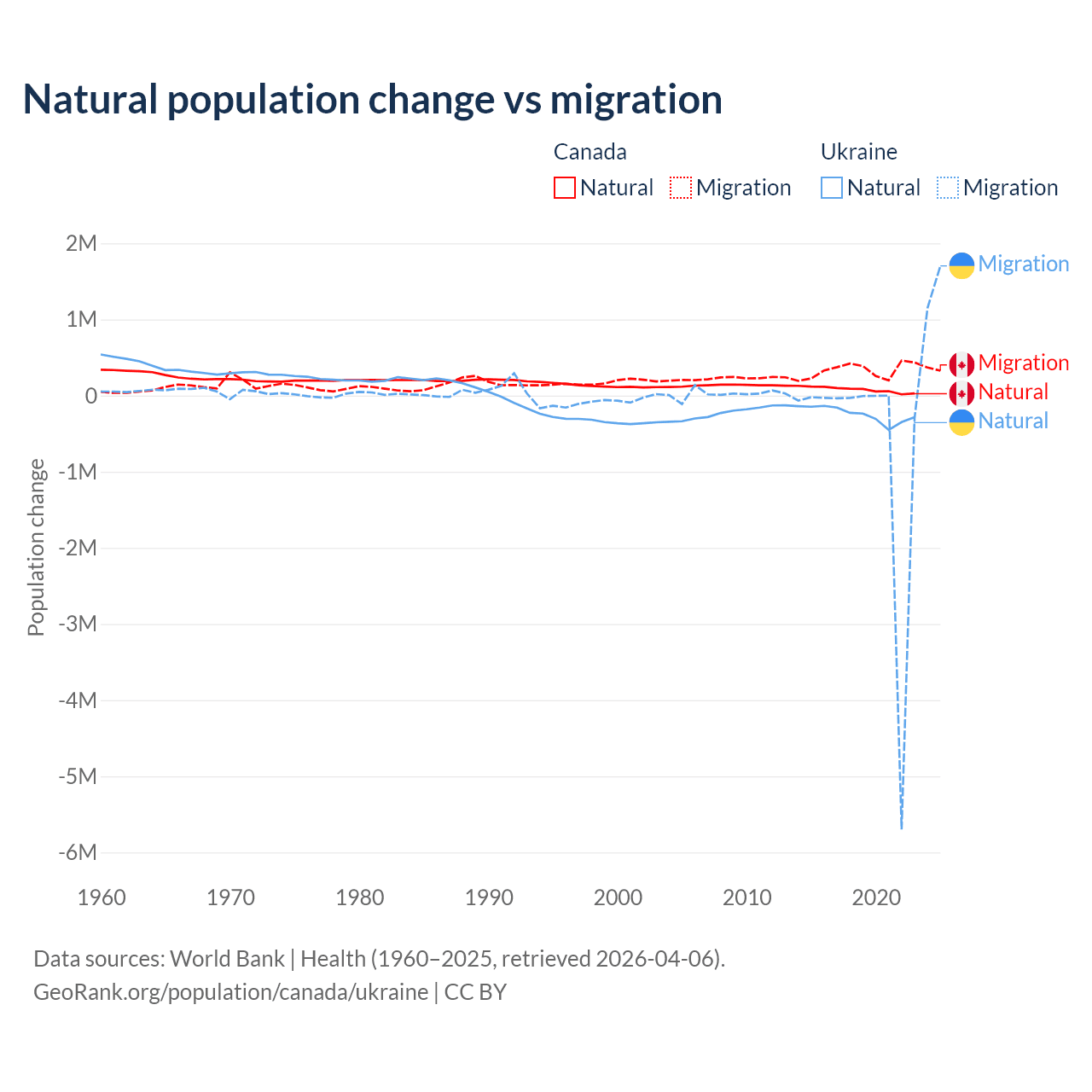 Over the last 10 years, 19.4% of the population change in Canada is from natural causes (a gain of 789,345 people) and 80.6% is from migration (a gain of 3,276,554 people). In Ukraine 28.2% is from natural causes (a loss of 2,435,153 people) and 71.8% is from migration (a loss of 6,198,995 people).
