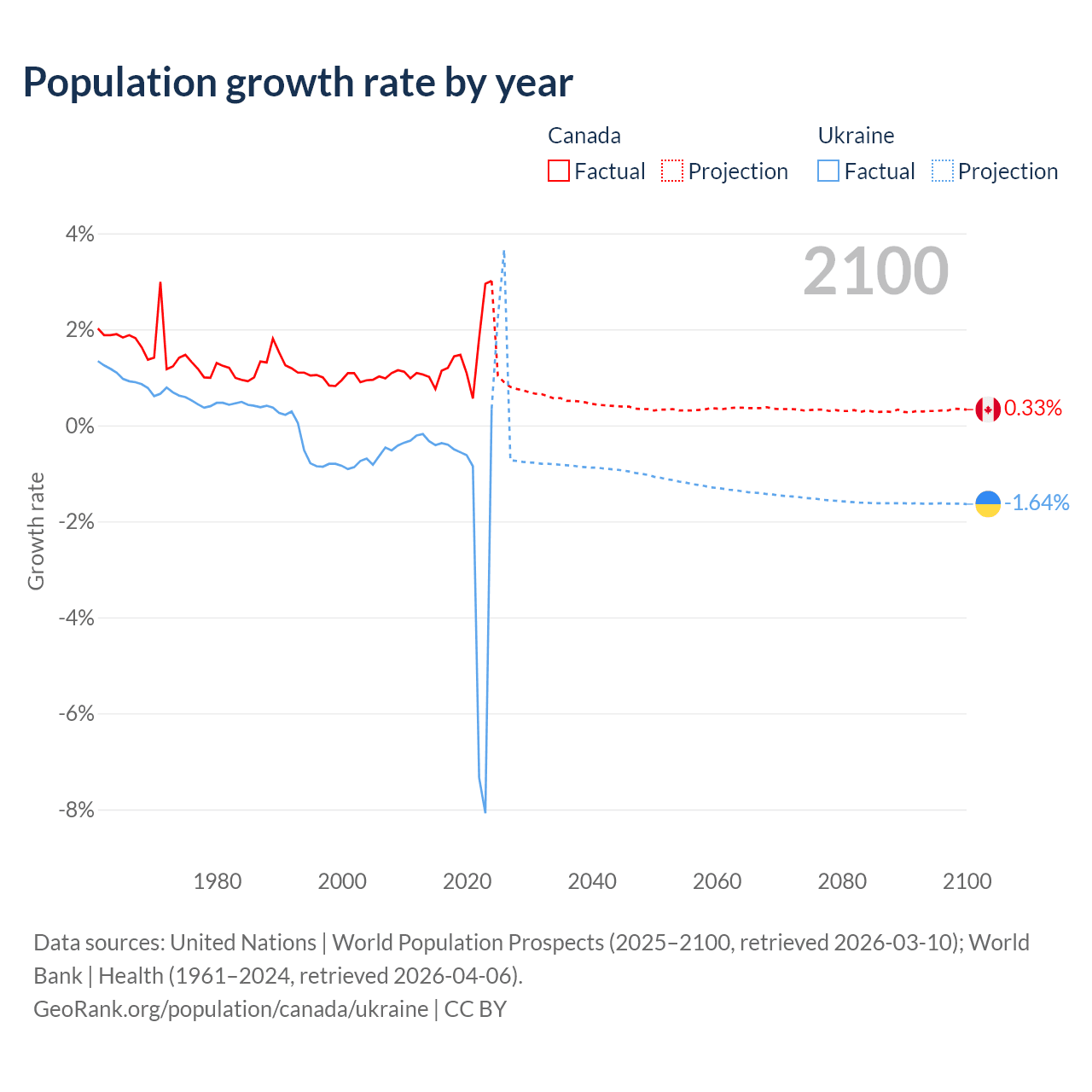 - For the last 10 years, Canada has had an average growth rate of +1.5% per year vs -1.74% in Ukraine.