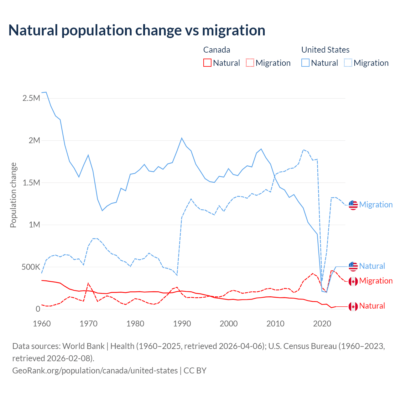 Data sources: World Bank | Health (1960–2025, retrieved 2026-04-06); U.S. Census Bureau (1960–2023, retrieved 2026-02-08).