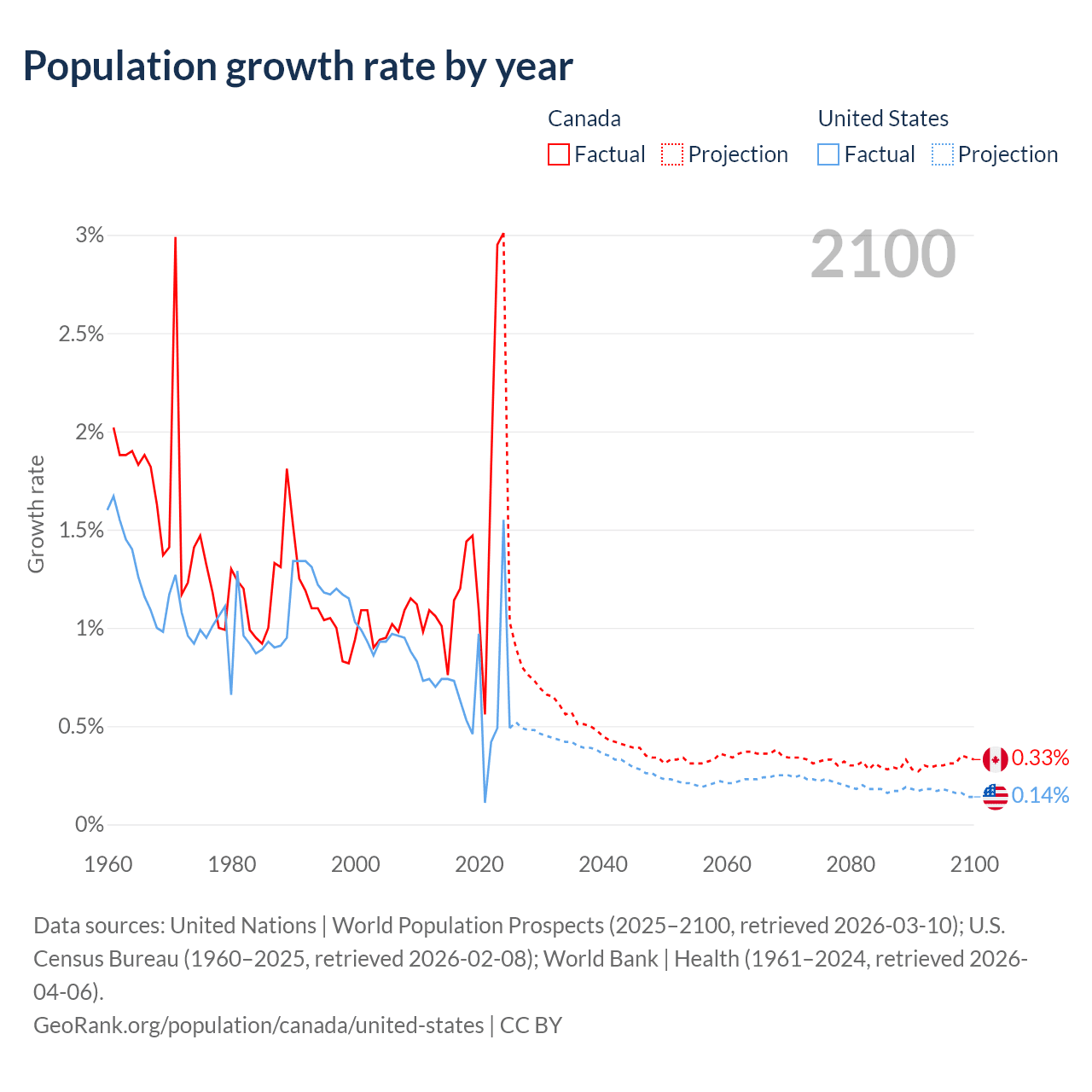 Data sources: World Bank | Health (1960–2024, retrieved 2026-04-06); United Nations | World Population Prospects (1960–2026, retrieved 2026-03-10); U.S. Census Bureau (1960–2025, retrieved 2026-02-08); Central Intelligence Agency (CIA) (2000–2019, retrieved 2026-02-20).