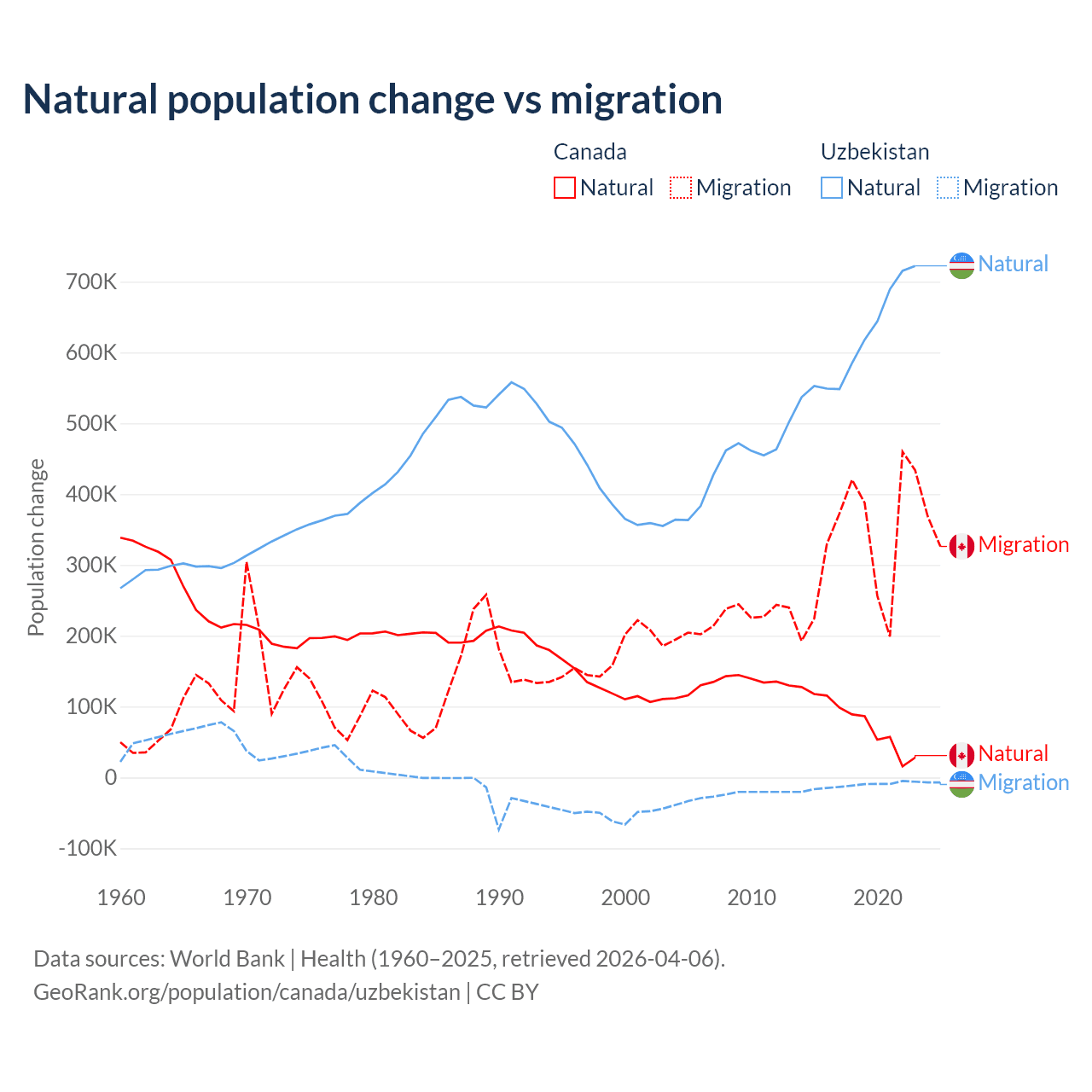 Over the last 10 years, 19.4% of the population change in Canada is from natural causes (a gain of 789,345 people) and 80.6% is from migration (a gain of 3,276,554 people). In Uzbekistan 98.2% is from natural causes (a gain of 6,161,117 people) and 1.84% is from migration (a loss of 115,398 people).