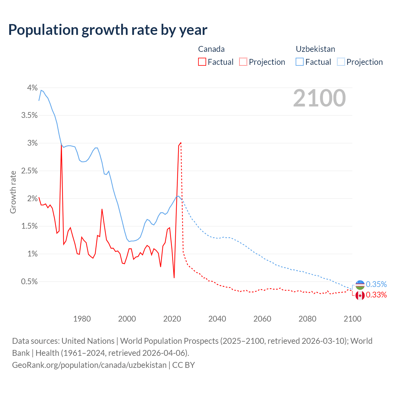 - For the last 10 years, Canada has had an average growth rate of +1.5% per year vs +1.85% in Uzbekistan.