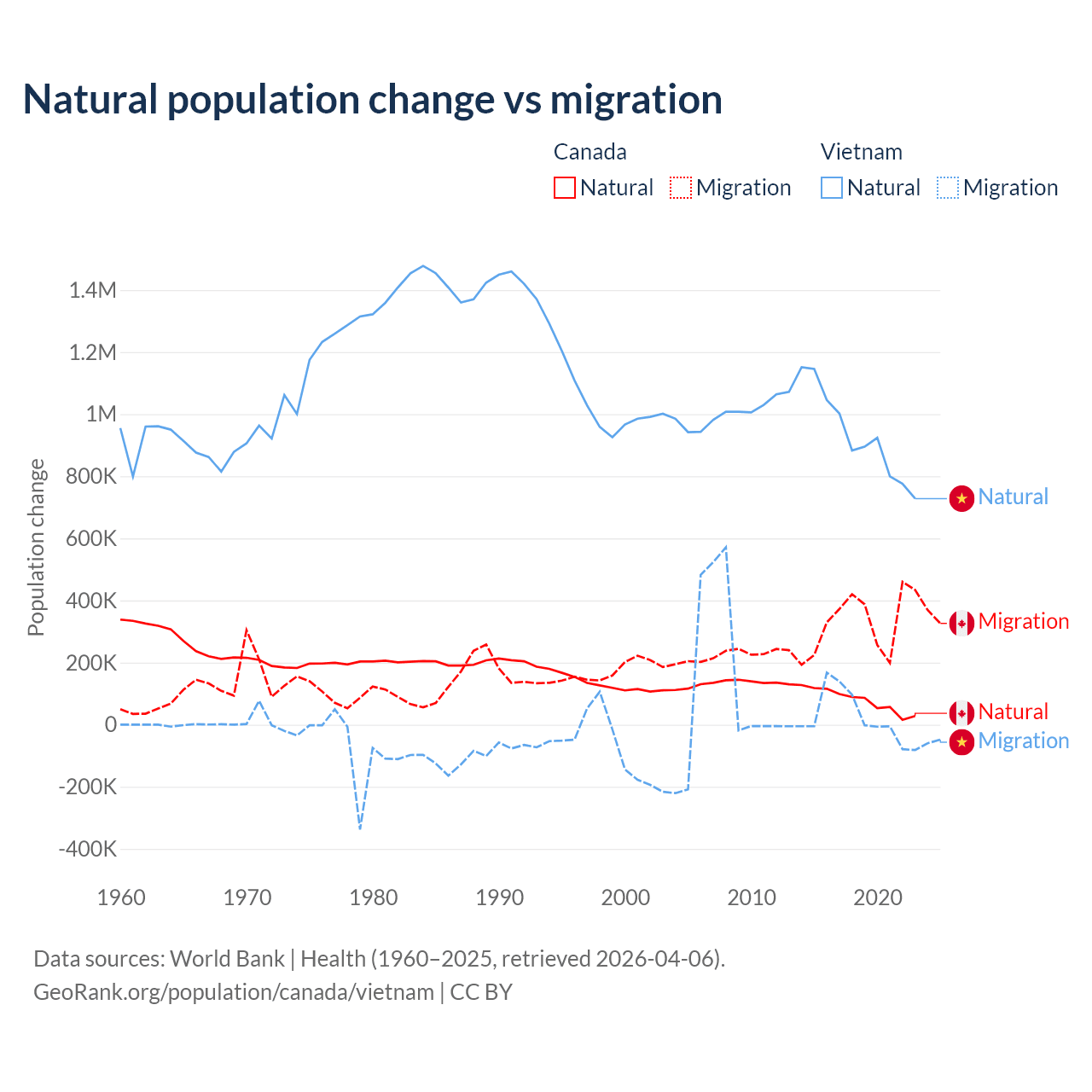 Over the last 10 years, 19.4% of the population change in Canada is from natural causes (a gain of 789,345 people) and 80.6% is from migration (a gain of 3,276,554 people). In Vietnam 97.7% is from natural causes (a gain of 9,349,756 people) and 2.29% is from migration (a gain of 219,073 people).
