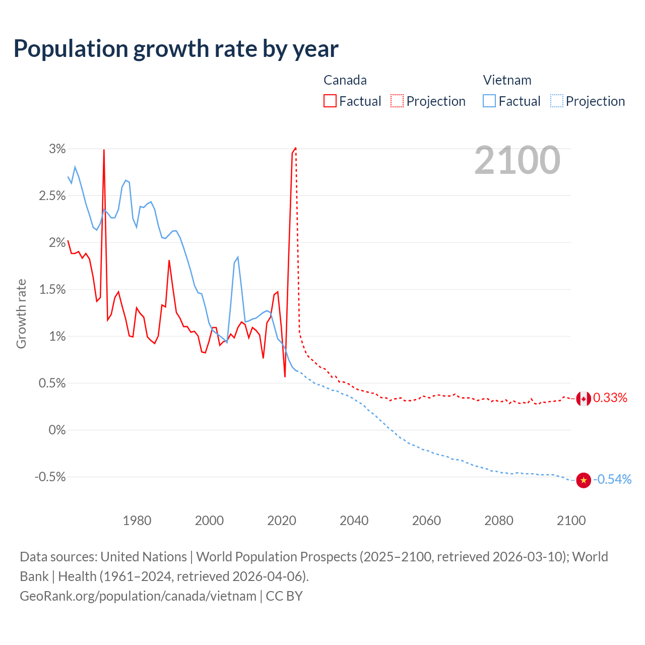 - For the last 10 years, Canada has had an average growth rate of +1.5% per year vs +0.99% in Vietnam.