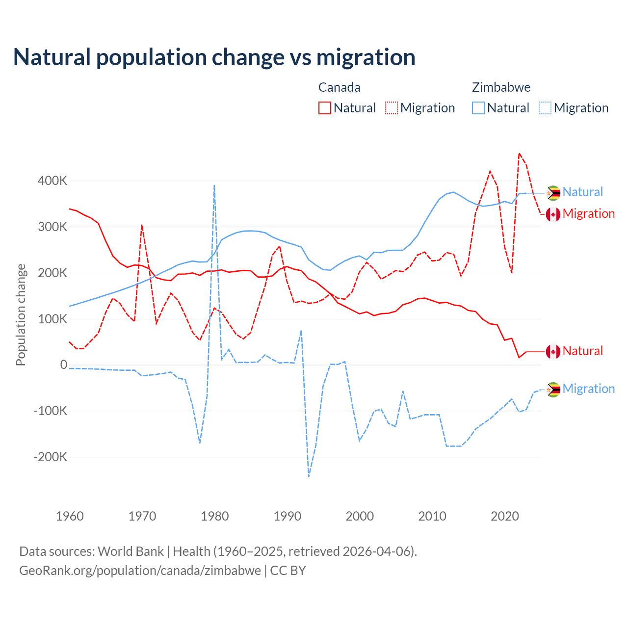 Over the last 10 years, 19.4% of the population change in Canada is from natural causes (a gain of 789,345 people) and 80.6% is from migration (a gain of 3,276,554 people). In Zimbabwe 74.9% is from natural causes (a gain of 3,558,487 people) and 25.1% is from migration (a loss of 1,192,807 people).