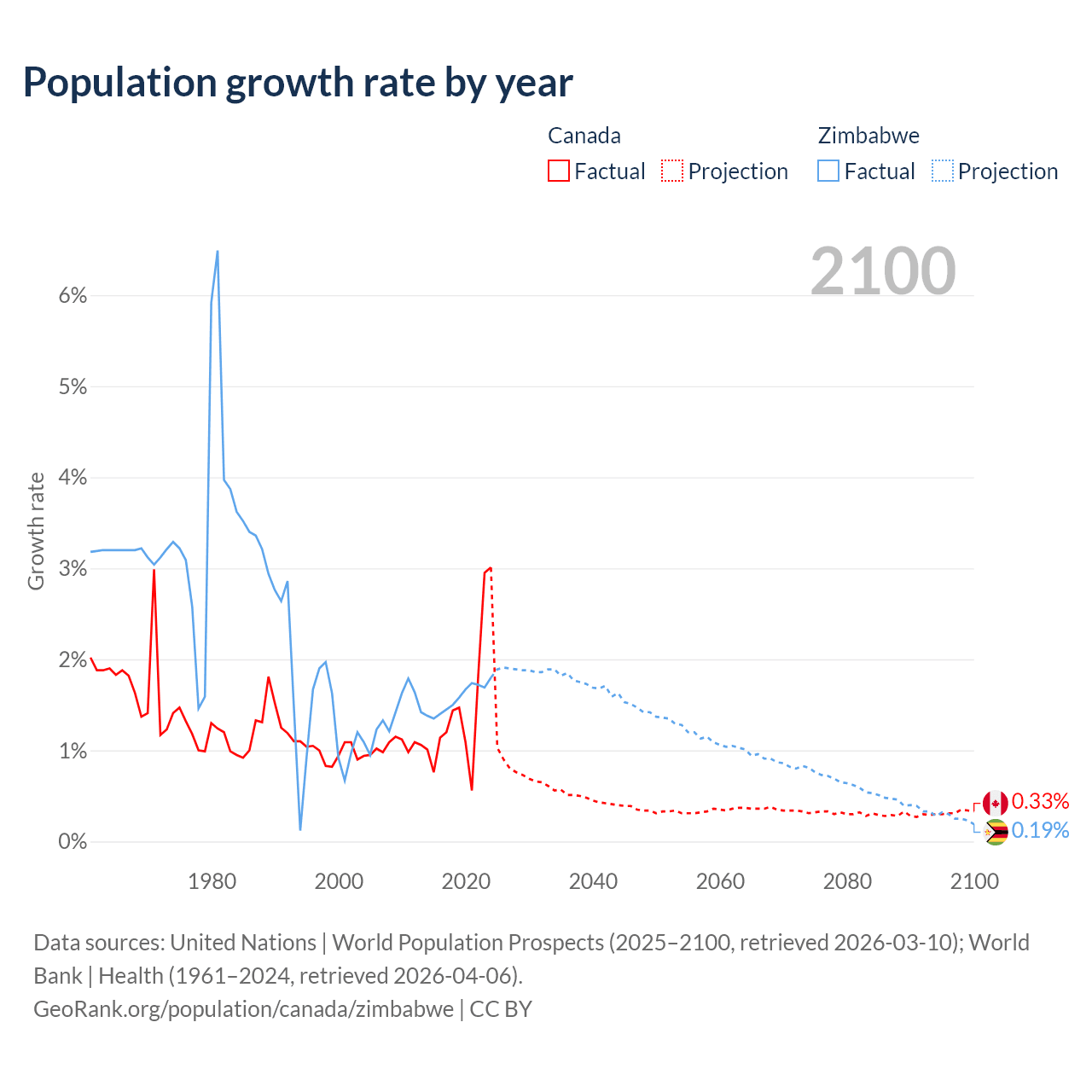 - For the last 10 years, Canada has had an average growth rate of +1.5% per year vs +1.57% in Zimbabwe.