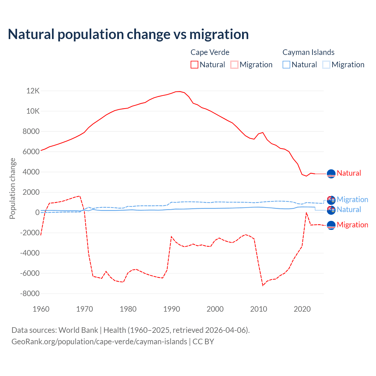 Over the last 10 years, 56.4% of the population change in Cape Verde is from natural causes (a gain of 50,193 people) and 43.6% is from migration (a loss of 38,879 people). In the Cayman Islands 31.1% is from natural causes (a gain of 4,468 people) and 68.9% is from migration (a gain of 9,879 people).