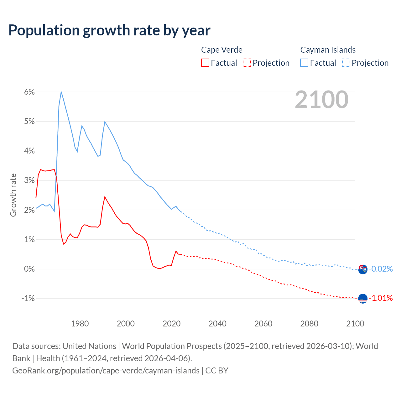 - For the last 10 years, Cape Verde has had an average growth rate of +0.22% per year vs +2.19% in the Cayman Islands.