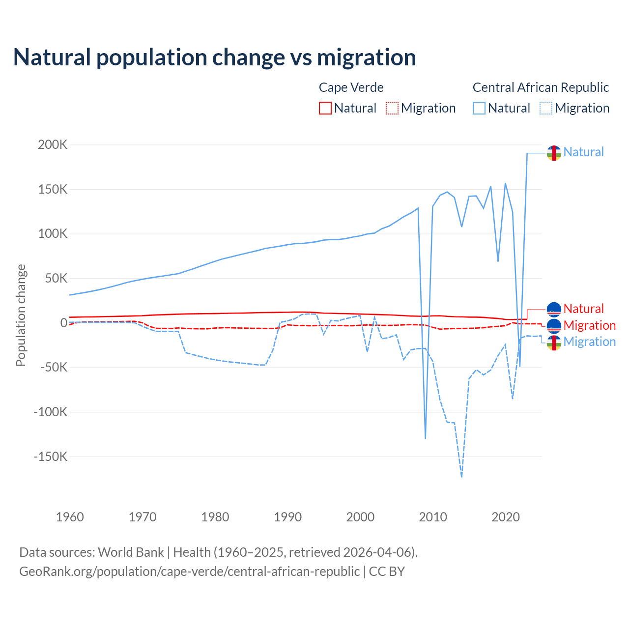 Over the last 10 years, 56.4% of the population change in Cape Verde is from natural causes (a gain of 50,193 people) and 43.6% is from migration (a loss of 38,879 people). In the Central African Republic 66.7% is from natural causes (a gain of 1,164,312 people) and 33.3% is from migration (a loss of 580,593 people).