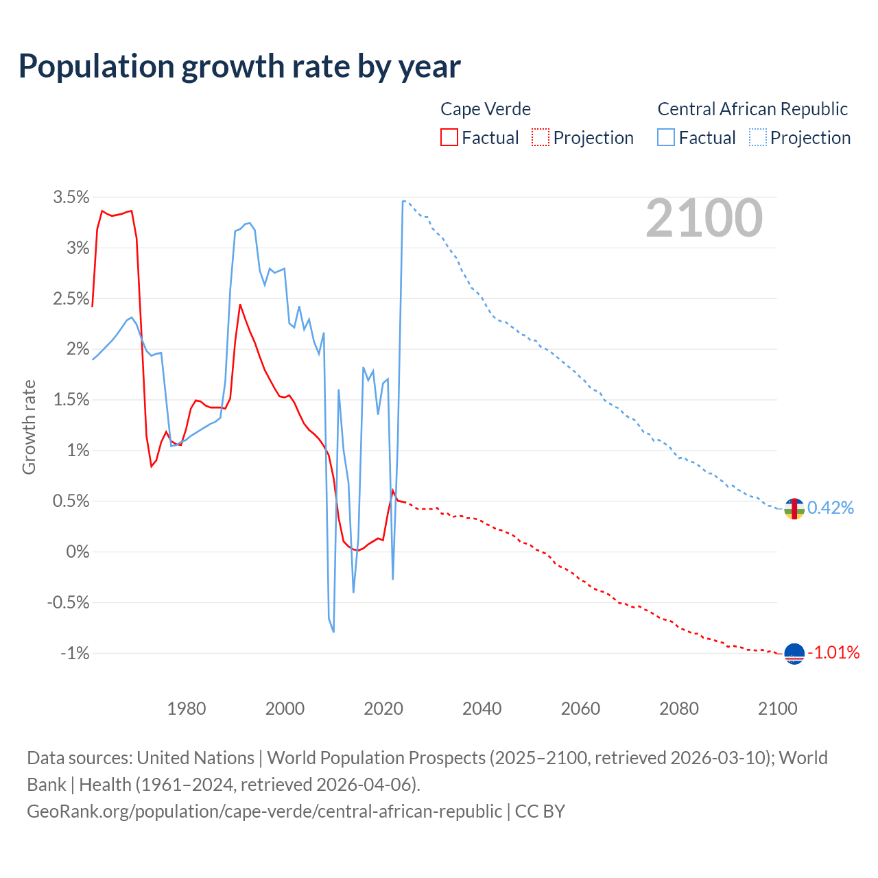 - For the last 10 years, Cape Verde has had an average growth rate of +0.22% per year vs +1.27% in the Central African Republic.