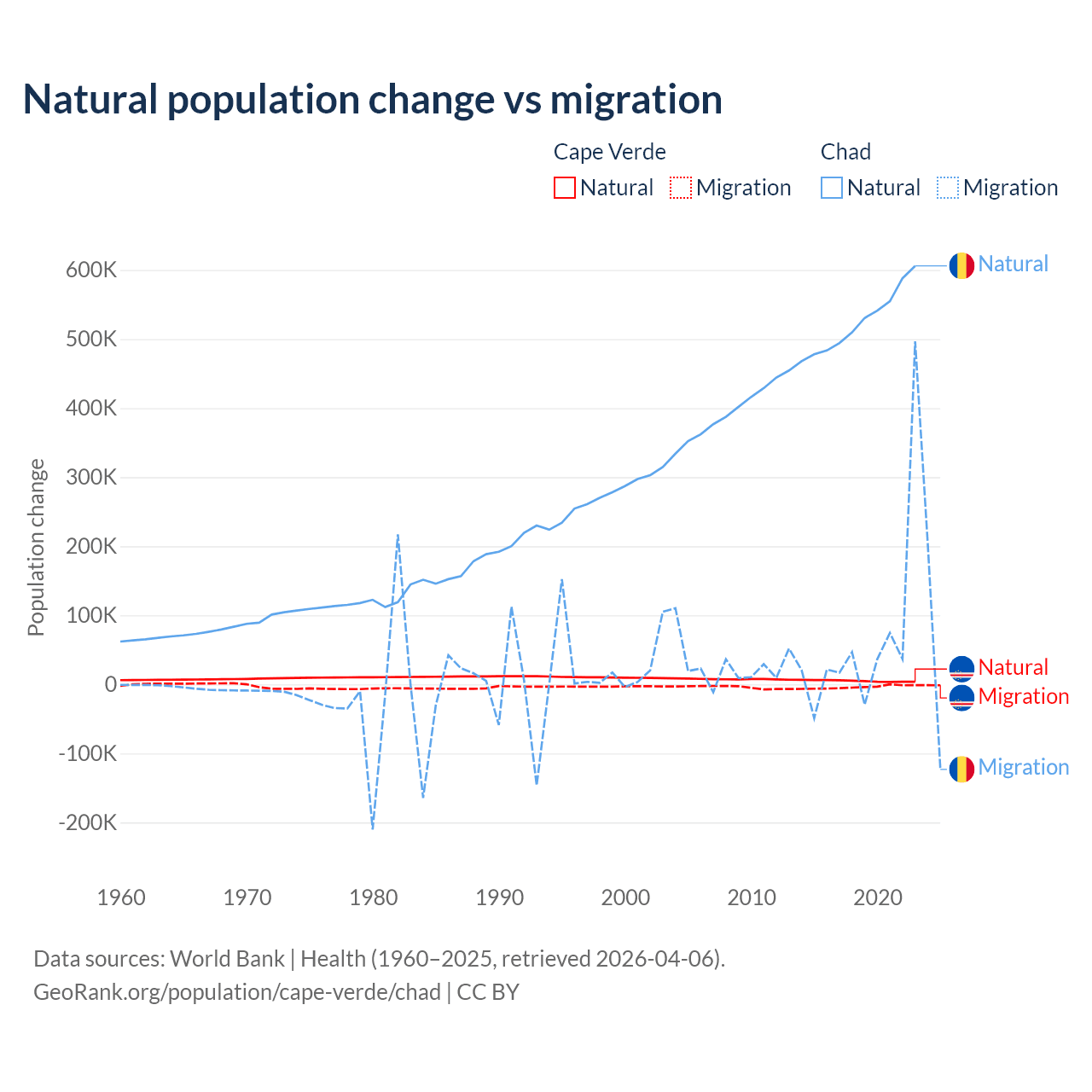 Over the last 10 years, 56.4% of the population change in Cape Verde is from natural causes (a gain of 50,193 people) and 43.6% is from migration (a loss of 38,879 people). In Chad 88.7% is from natural causes (a gain of 5,253,964 people) and 11.3% is from migration (a gain of 672,204 people).