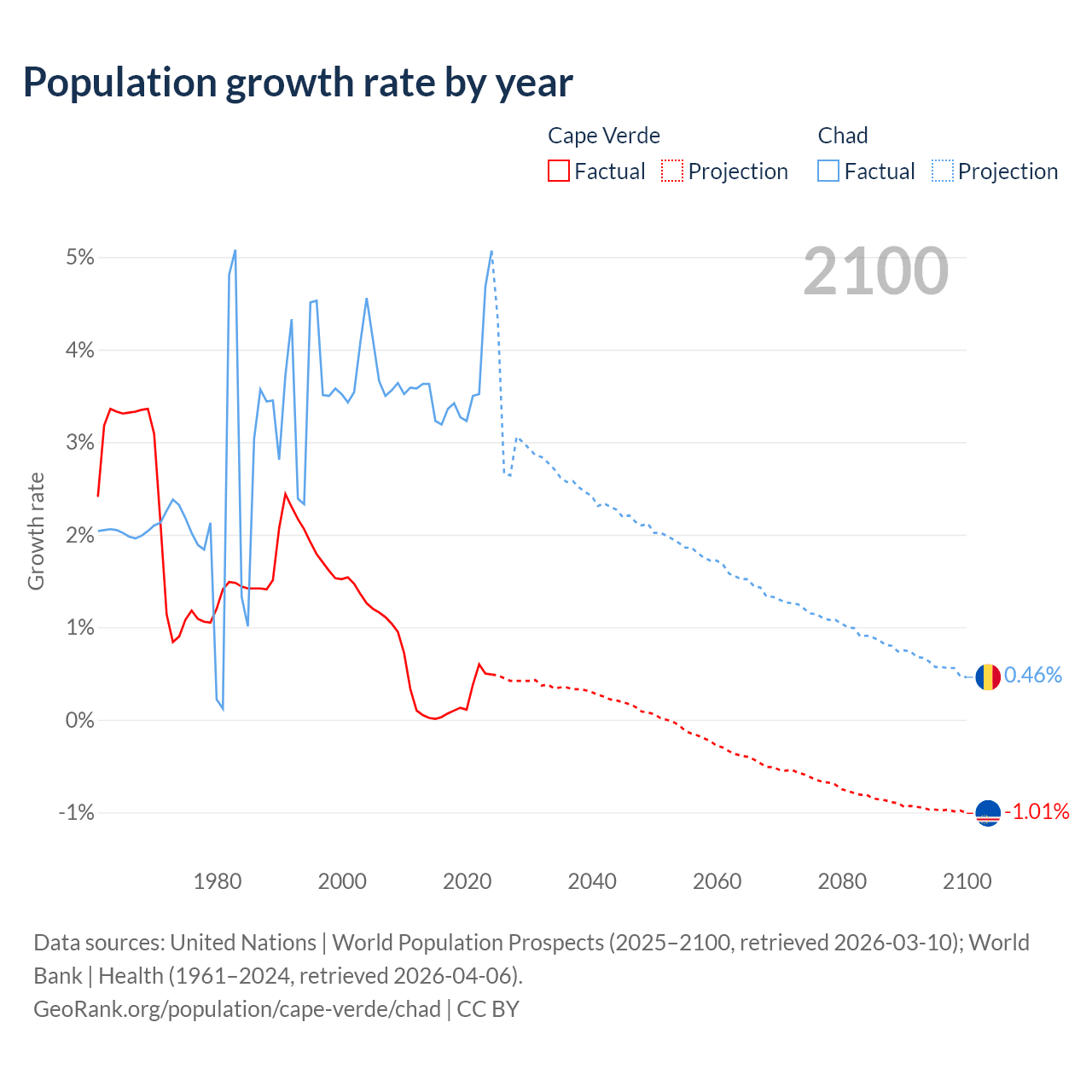 - For the last 10 years, Cape Verde has had an average growth rate of +0.22% per year vs +3.65% in Chad.