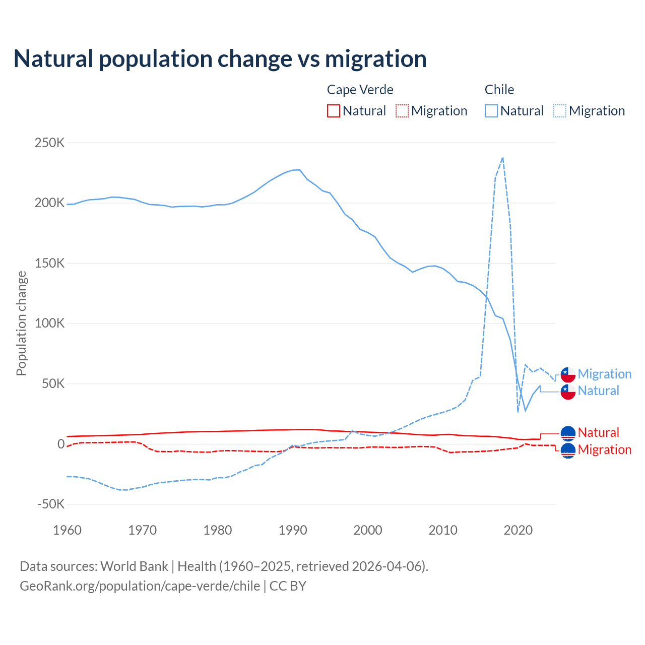 Over the last 10 years, 56.4% of the population change in Cape Verde is from natural causes (a gain of 50,193 people) and 43.6% is from migration (a loss of 38,879 people). In Chile 43.5% is from natural causes (a gain of 844,683 people) and 56.5% is from migration (a gain of 1,097,597 people).