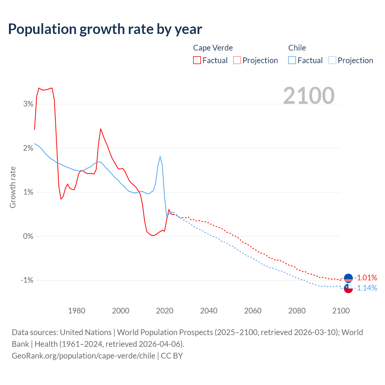 - For the last 10 years, Cape Verde has had an average growth rate of +0.22% per year vs +1.02% in Chile.