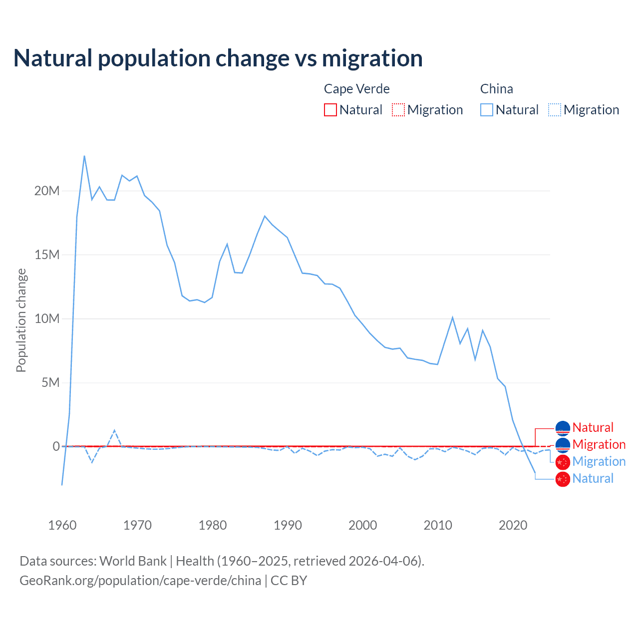 Over the last 10 years, 56.4% of the population change in Cape Verde is from natural causes (a gain of 50,193 people) and 43.6% is from migration (a loss of 38,879 people). In China 92.5% is from natural causes (a gain of 42,414,528 people) and 7.53% is from migration (a loss of 3,452,923 people).
