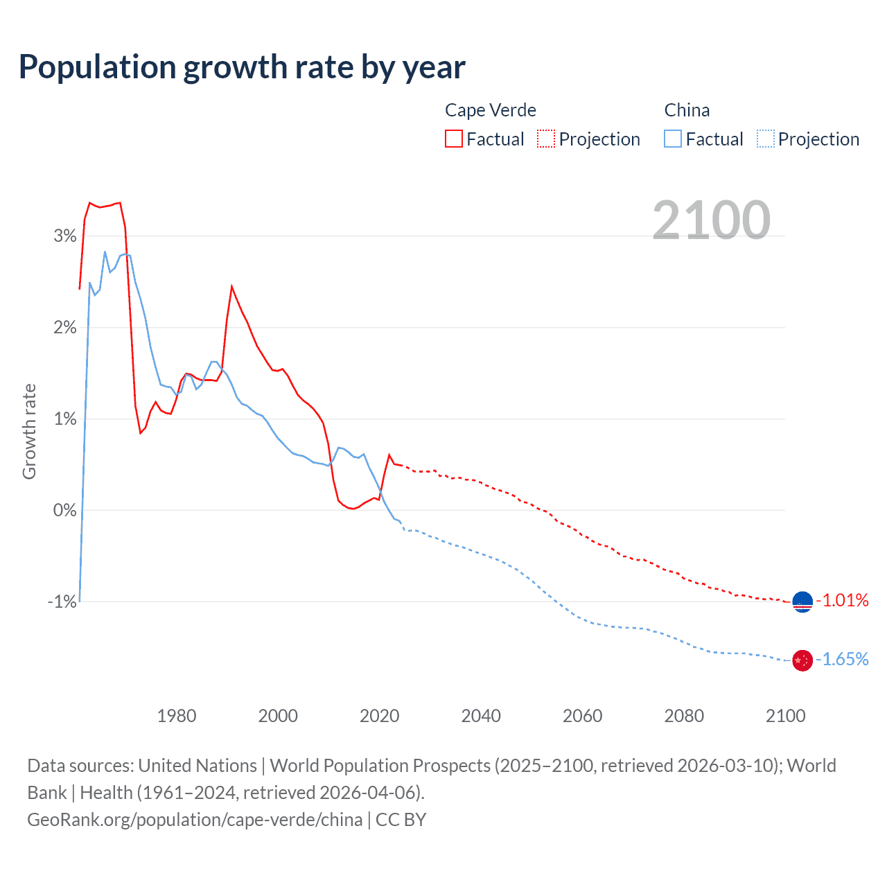 - For the last 10 years, Cape Verde has had an average growth rate of +0.22% per year vs +0.3% in China.