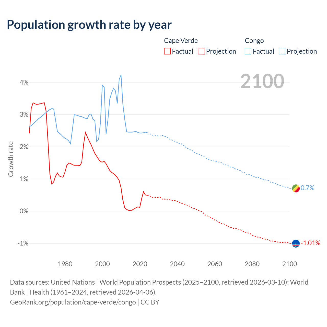 - For the last 10 years, Cape Verde has had an average growth rate of +0.22% per year vs +2.44% in the Congo.