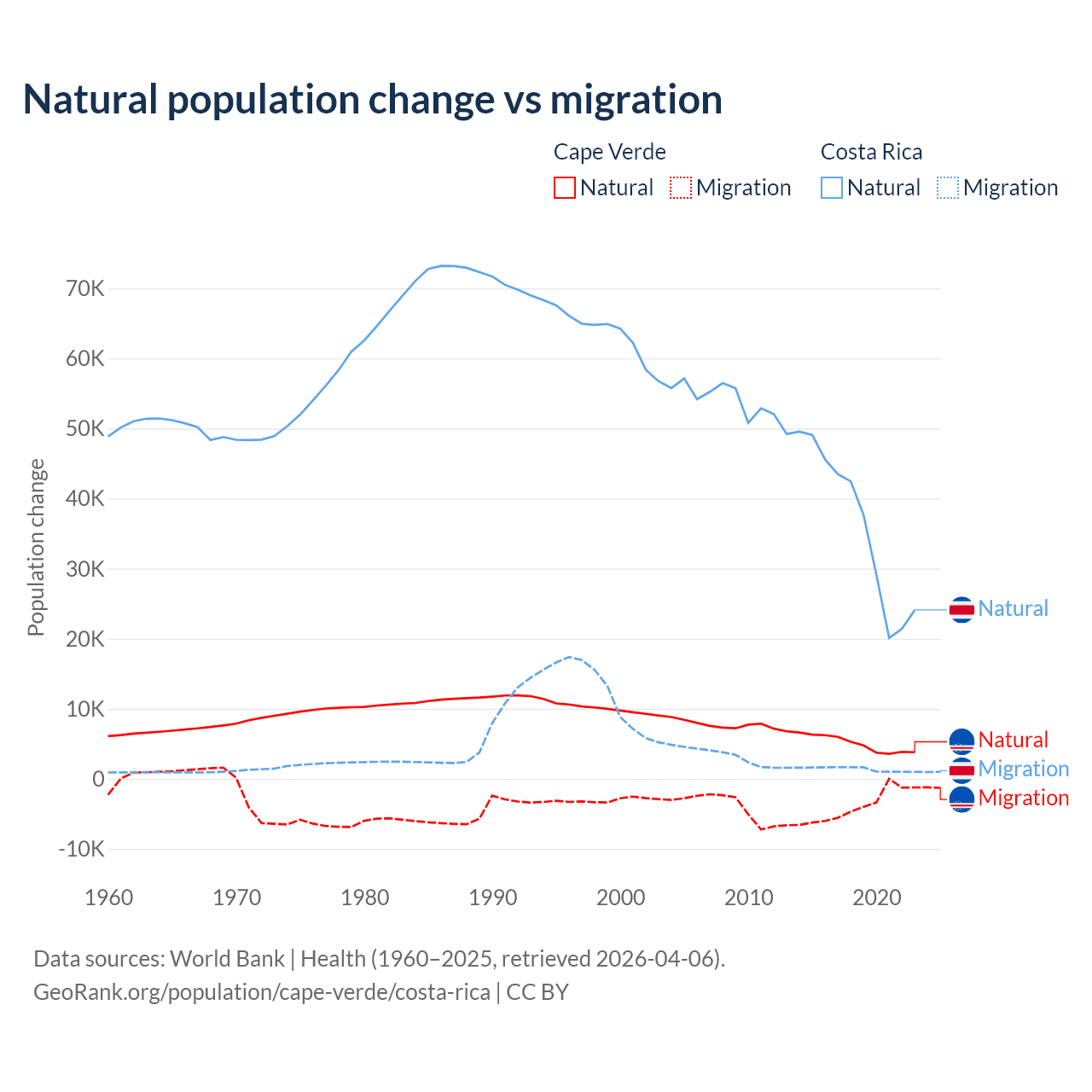 Over the last 10 years, 56.4% of the population change in Cape Verde is from natural causes (a gain of 50,193 people) and 43.6% is from migration (a loss of 38,879 people). In Costa Rica 96.3% is from natural causes (a gain of 362,624 people) and 3.69% is from migration (a gain of 13,900 people).