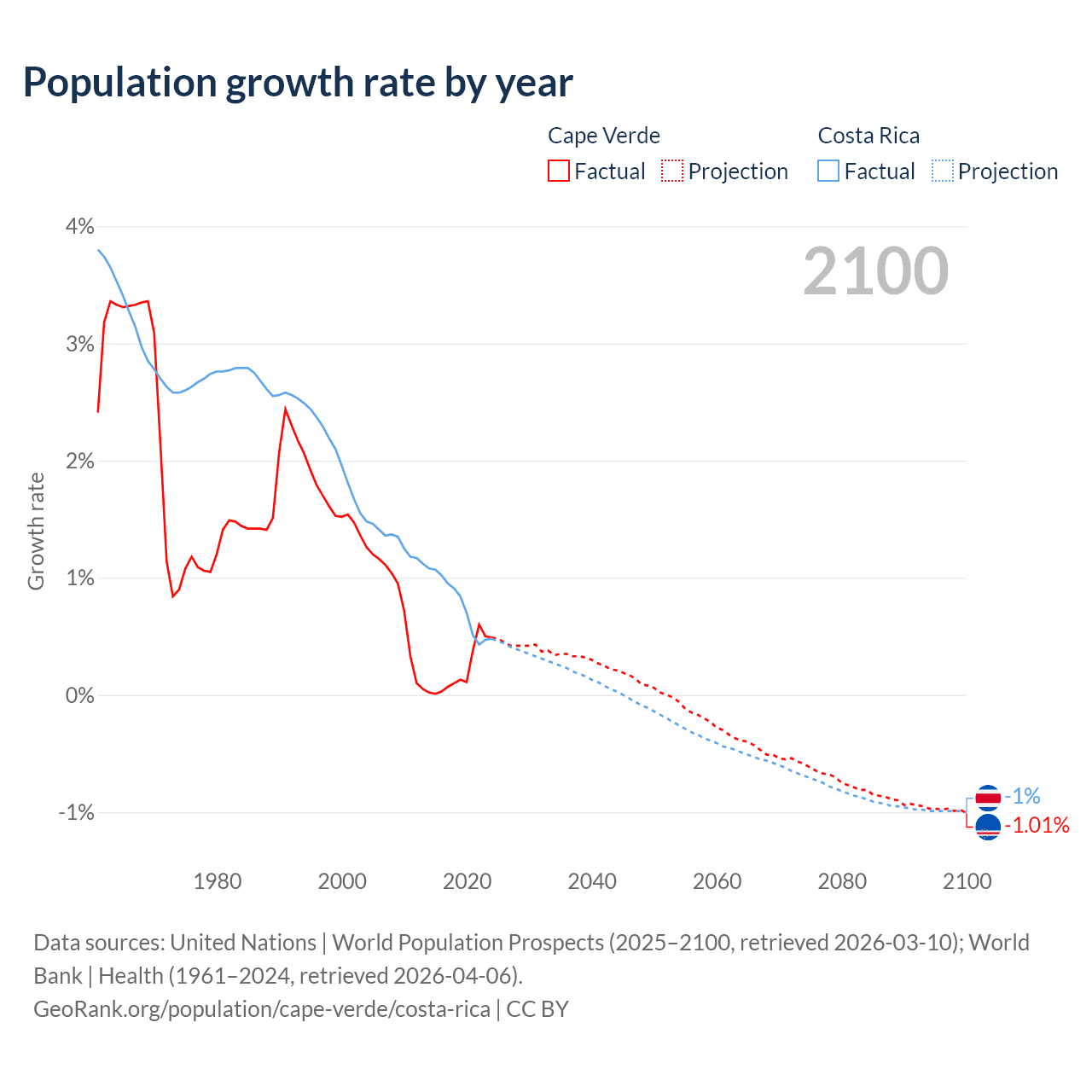 - For the last 10 years, Cape Verde has had an average growth rate of +0.22% per year vs +0.77% in Costa Rica.