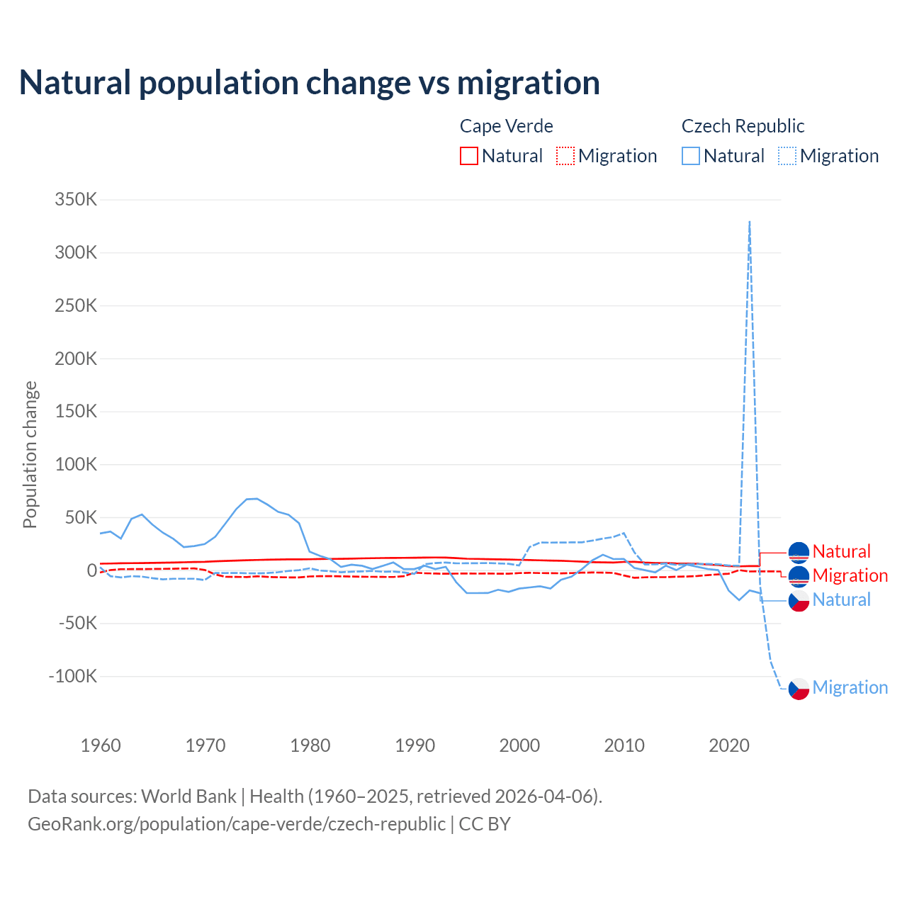 Over the last 10 years, 56.4% of the population change in Cape Verde is from natural causes (a gain of 50,193 people) and 43.6% is from migration (a loss of 38,879 people). In the Czech Republic 17.3% is from natural causes (a loss of 74,826 people) and 82.7% is from migration (a gain of 357,502 people).