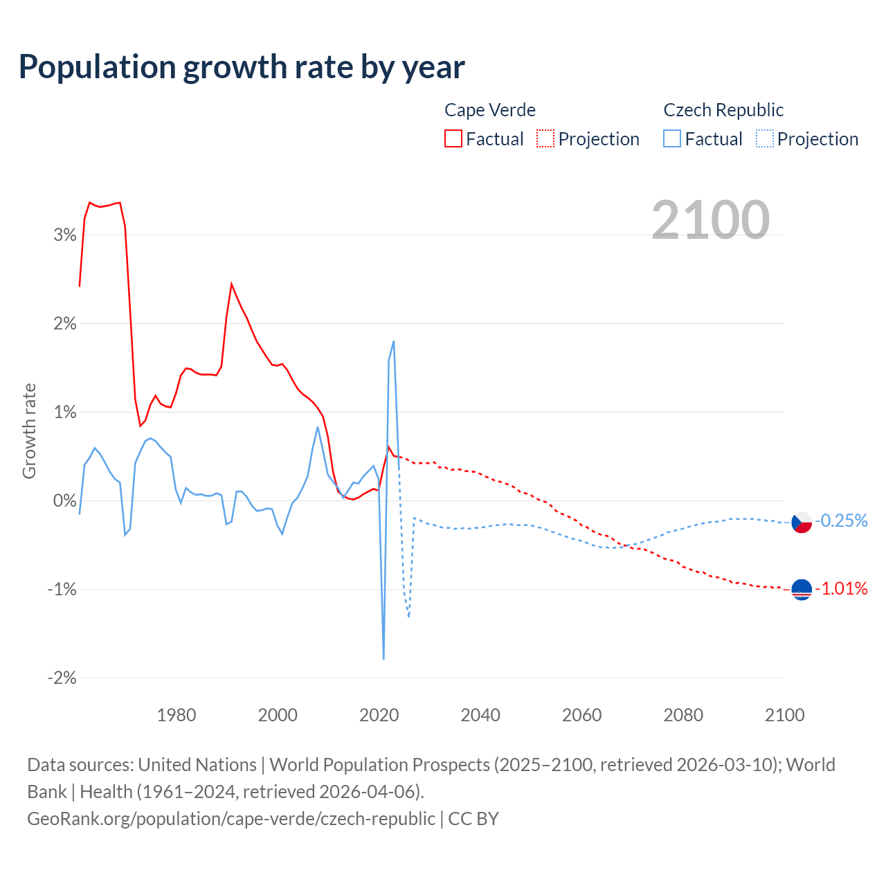 - For the last 10 years, Cape Verde has had an average growth rate of +0.22% per year vs +0.34% in the Czech Republic.