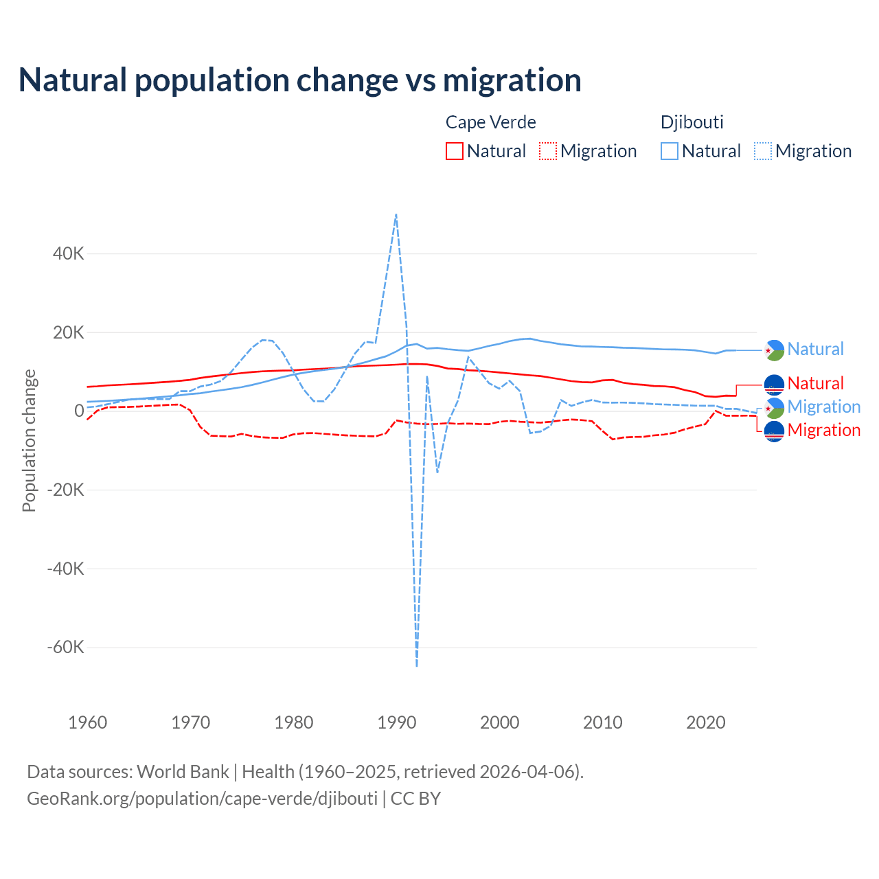 Over the last 10 years, 56.4% of the population change in Cape Verde is from natural causes (a gain of 50,193 people) and 43.6% is from migration (a loss of 38,879 people). In Djibouti 92.1% is from natural causes (a gain of 153,892 people) and 7.87% is from migration (a gain of 13,138 people).