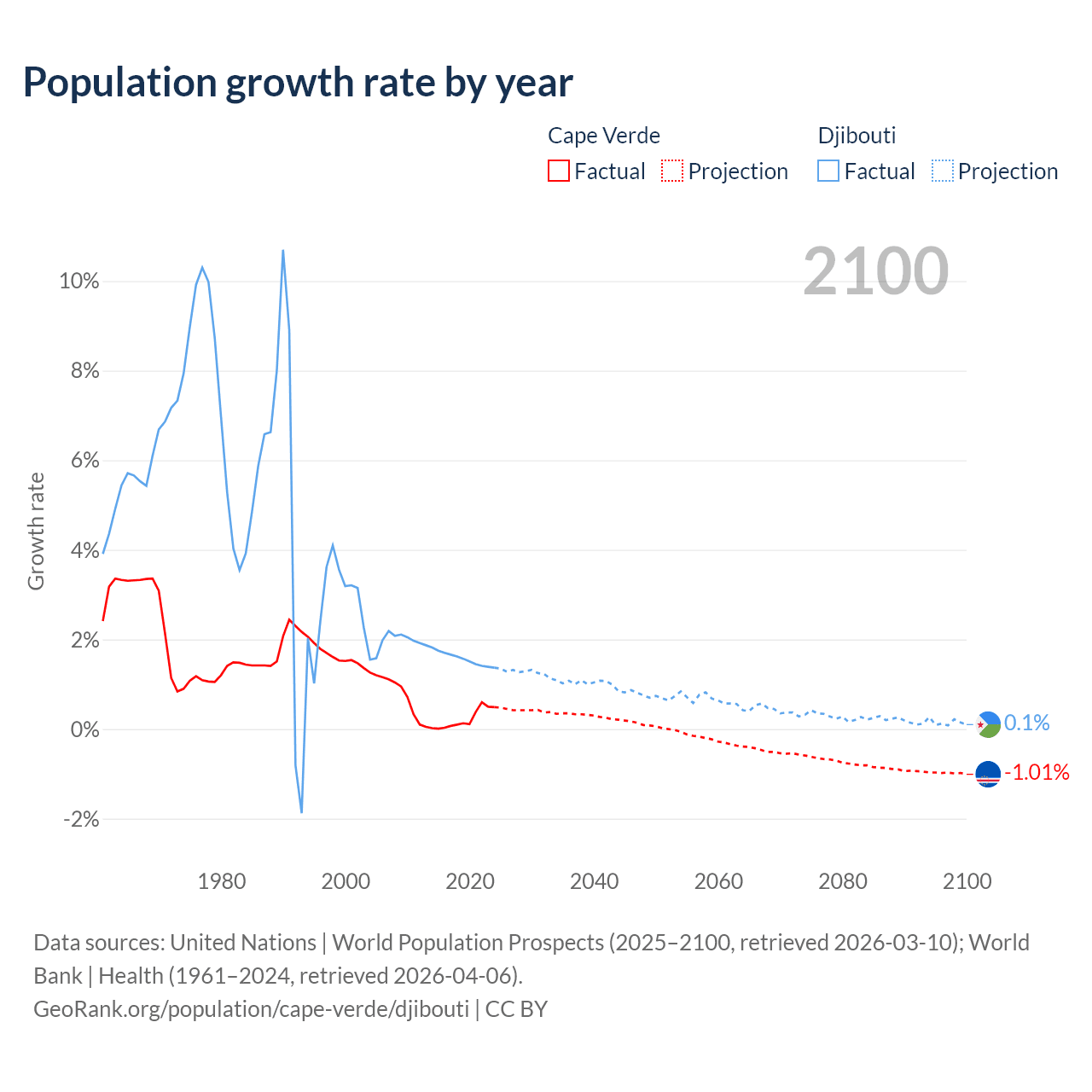 - For the last 10 years, Cape Verde has had an average growth rate of +0.22% per year vs +1.57% in Djibouti.